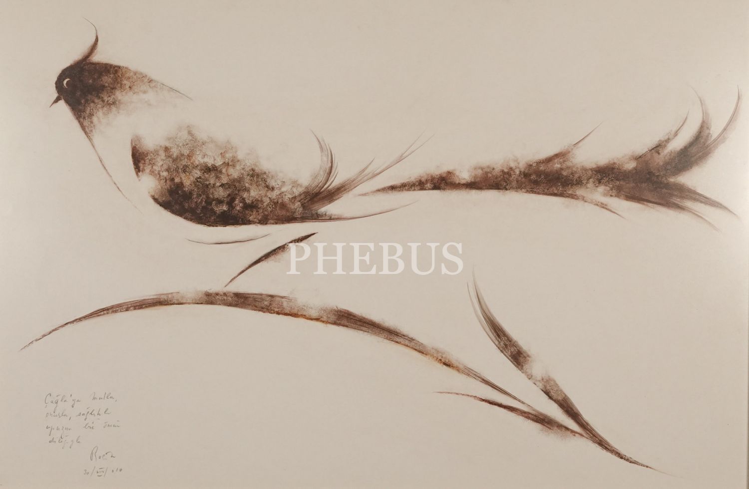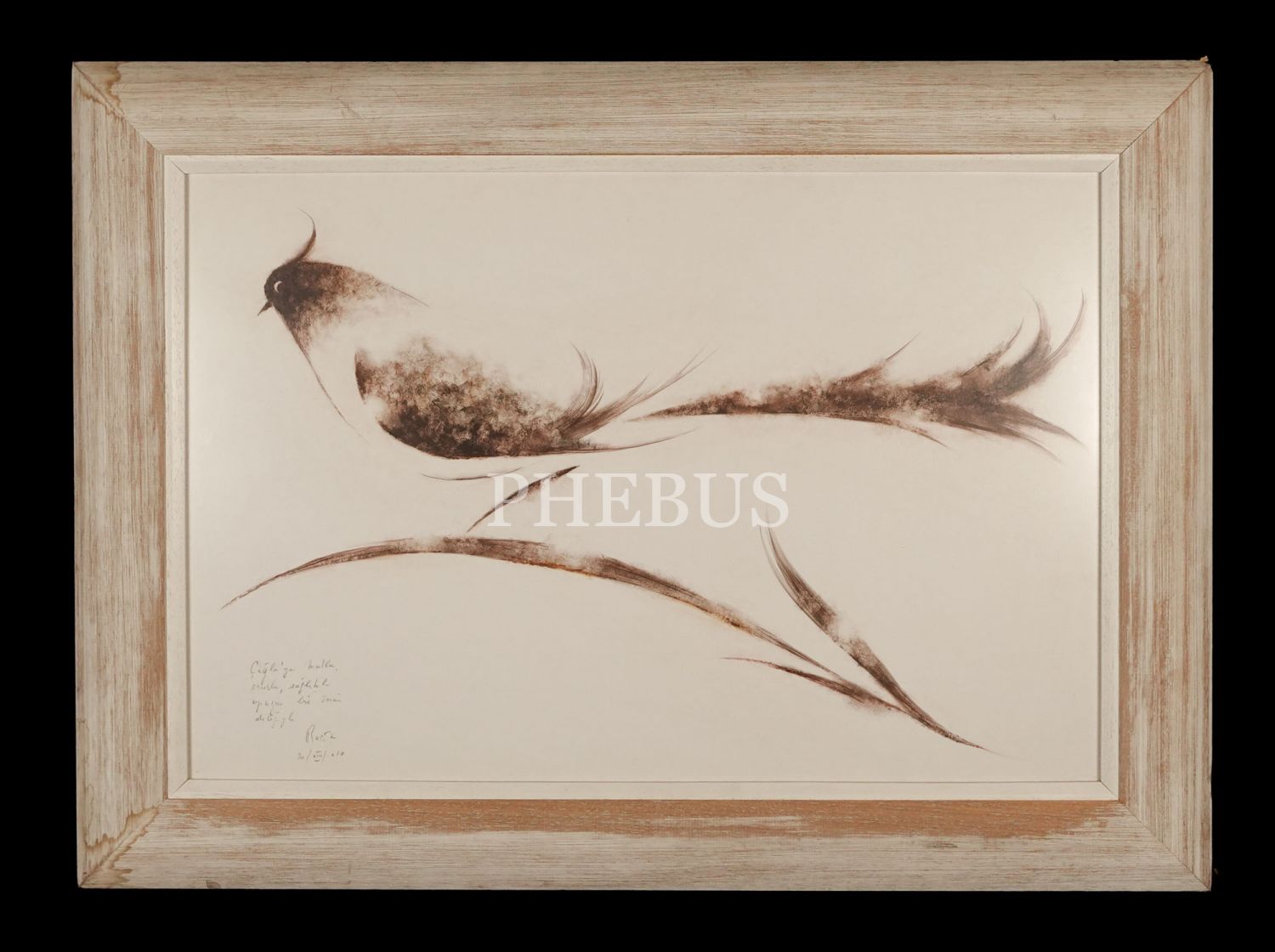 Rasin Arsebük'ten ithaflı ve imzalı güvercin resmi, 2010 tarihli, çerçevesiyle birlikte 84x62 cm...