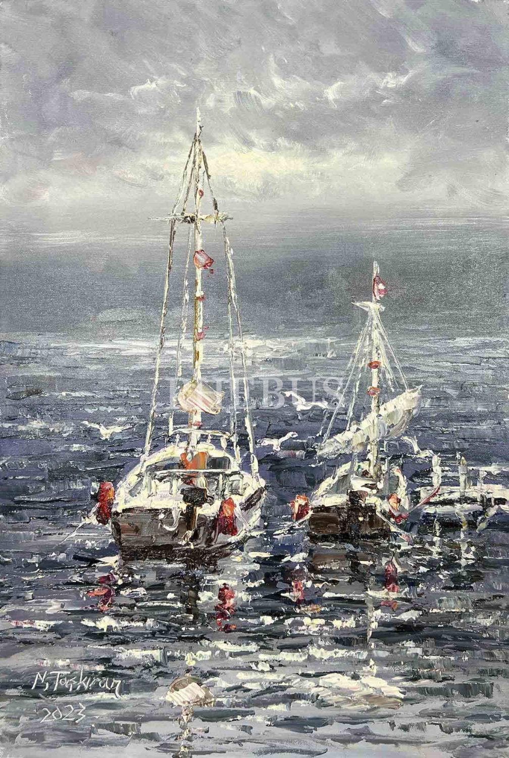 Nihat Taşkıran: "Yelkenliler", tuval üzeri yağlıboya, imzalı, 2023, en: 40 cm / boy: 60 cm...