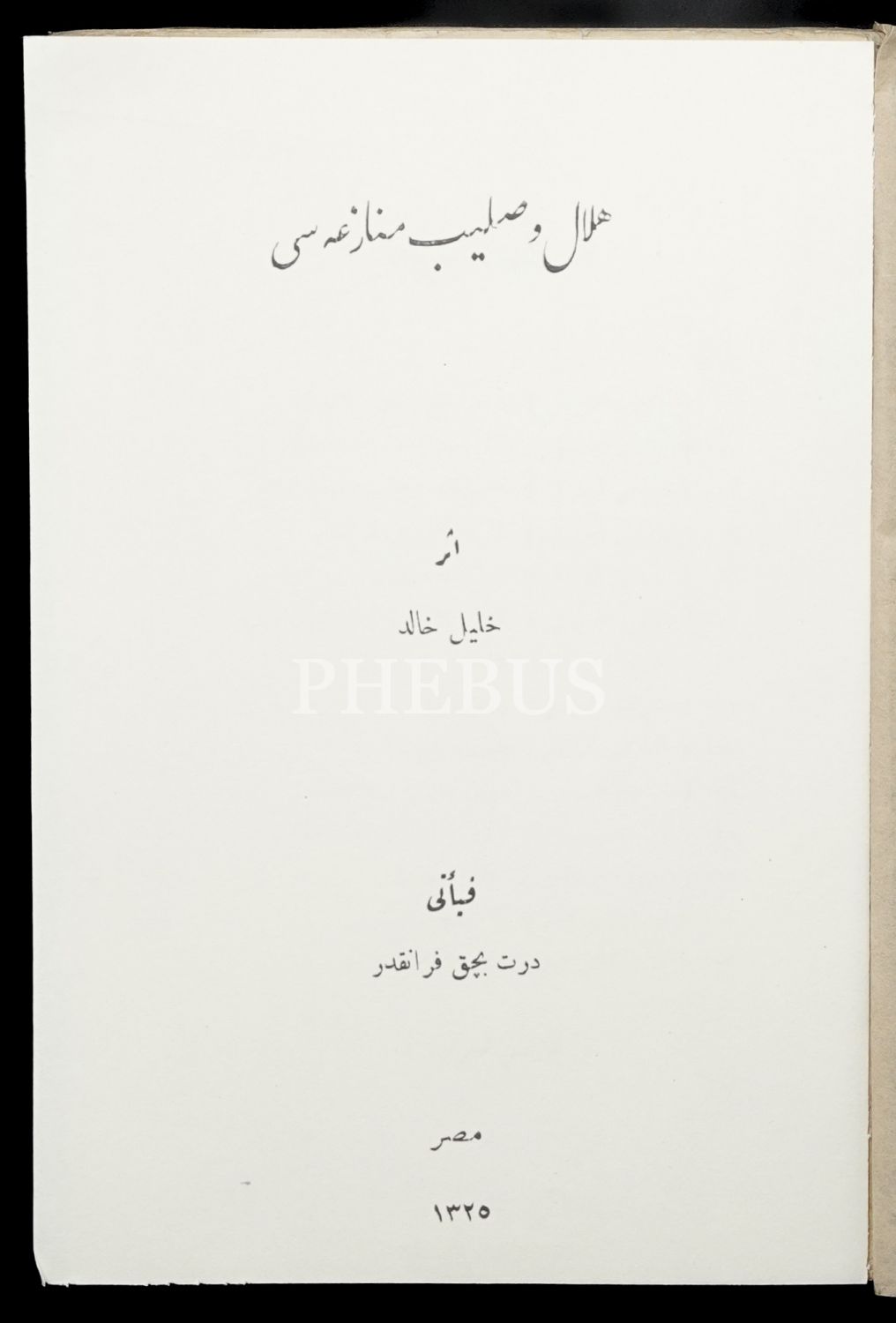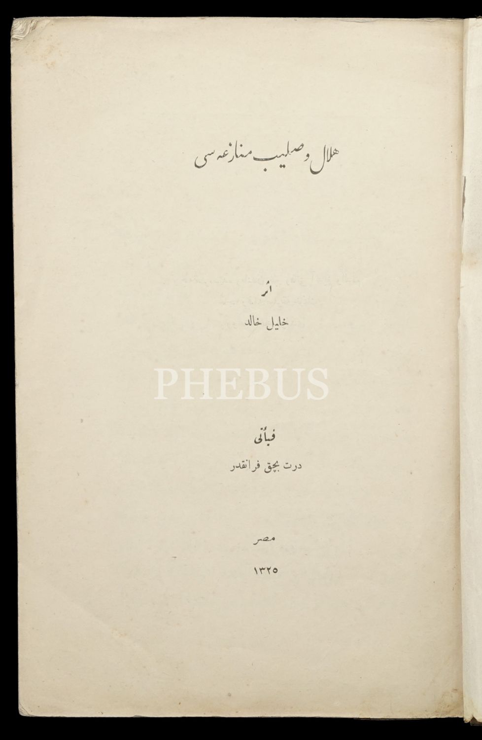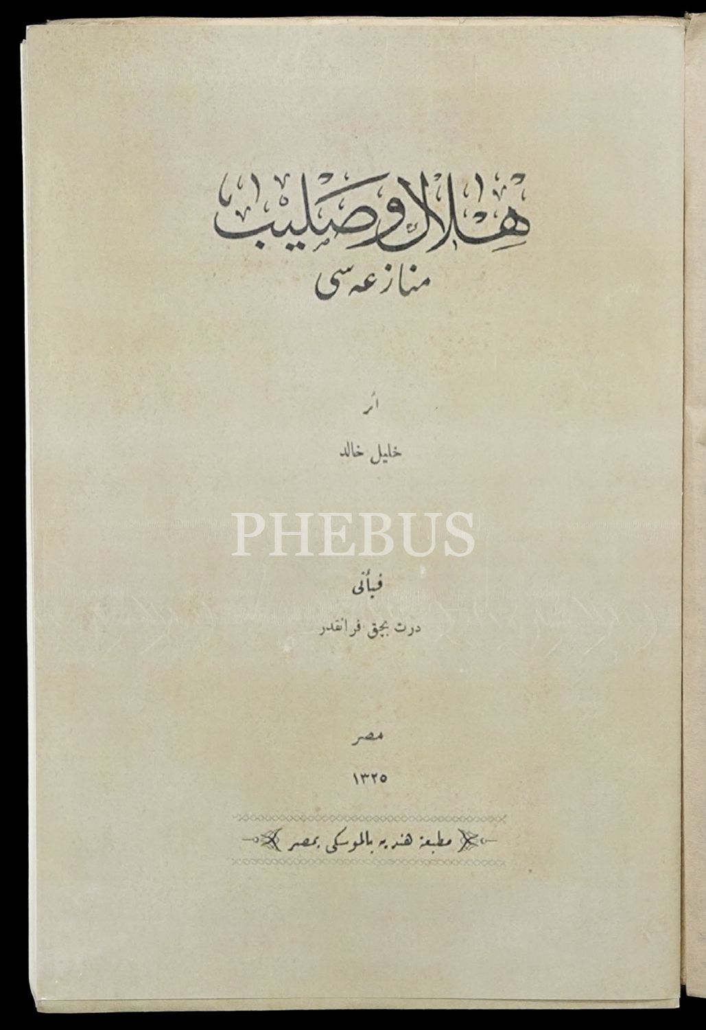 HİLÂL VE SALİB MÜNAZARASI, (Çeviren: Çerkeş Şeyhizâde Halil Halid), 1325 Kahire, Matbaa-i Hindiyye, 213 sayfa, 16x25 cm...