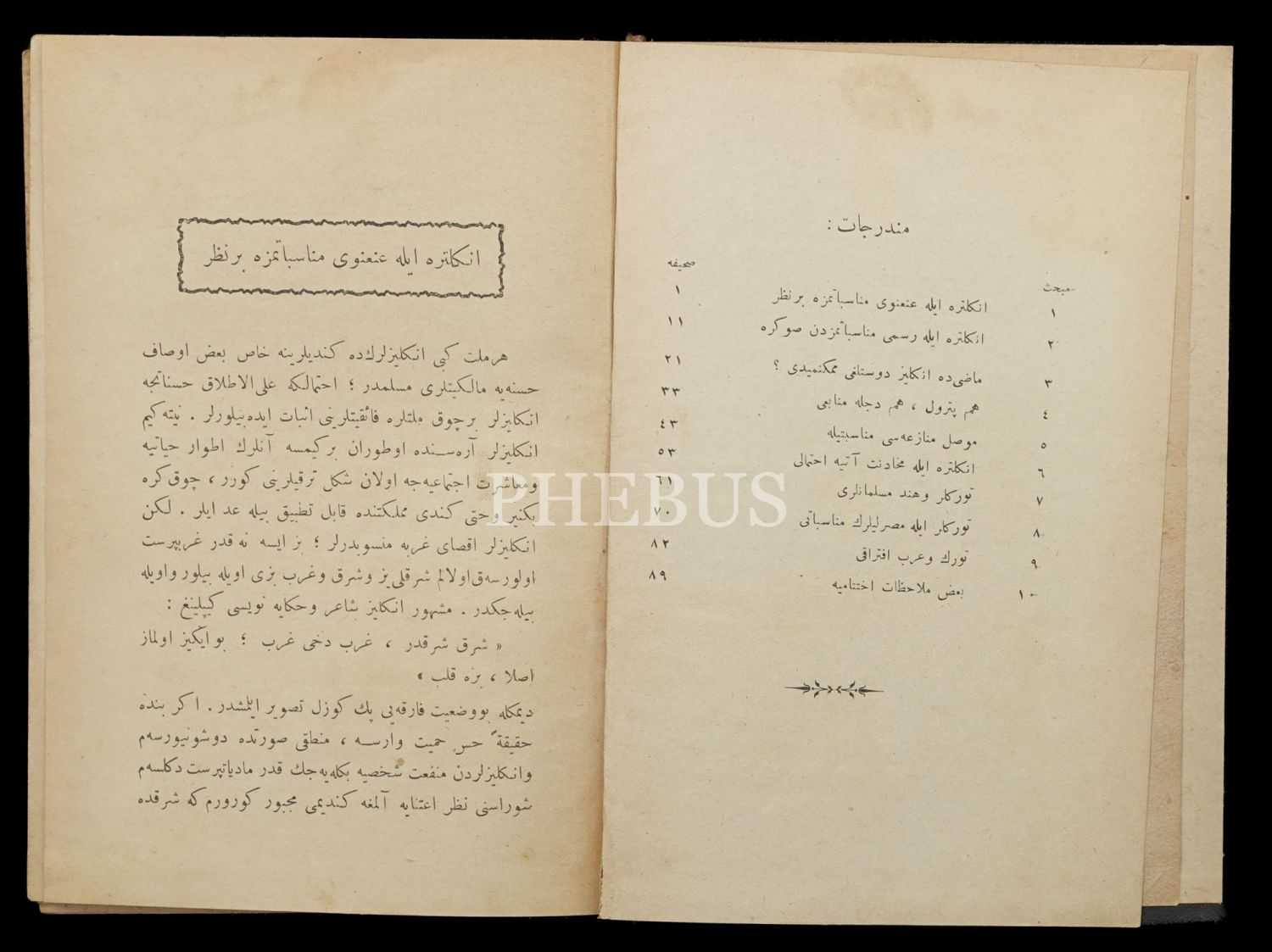 On makaleden oluşan eserin ilk altı makalesinde Türk-İngiliz ilişkilerine temas edilmekte, bu ilişkilerin tarihî seyri ve İngilizlerin emperyalist emelleri üzerinde durulmaktadır. Diğer makalelerde Türk-Hint Müslümanları arasındaki münasebetler, Türk-Mısır ilişkileri ve Türklerle Arapların birbirinden ayrılması konusu işlenmektedir.