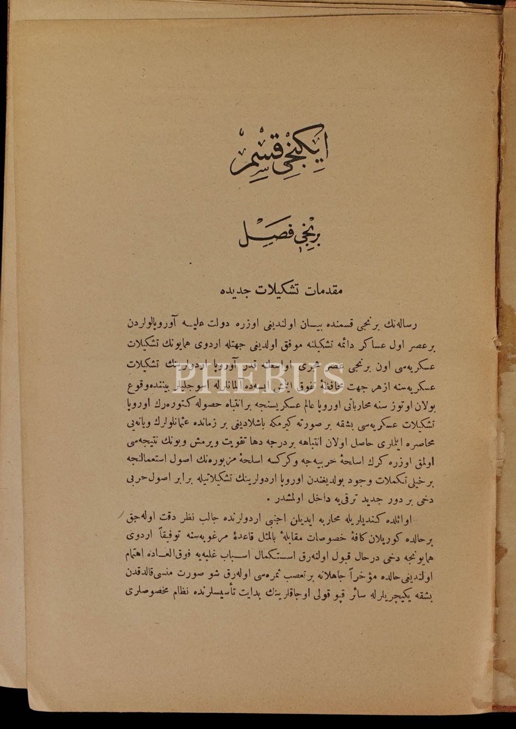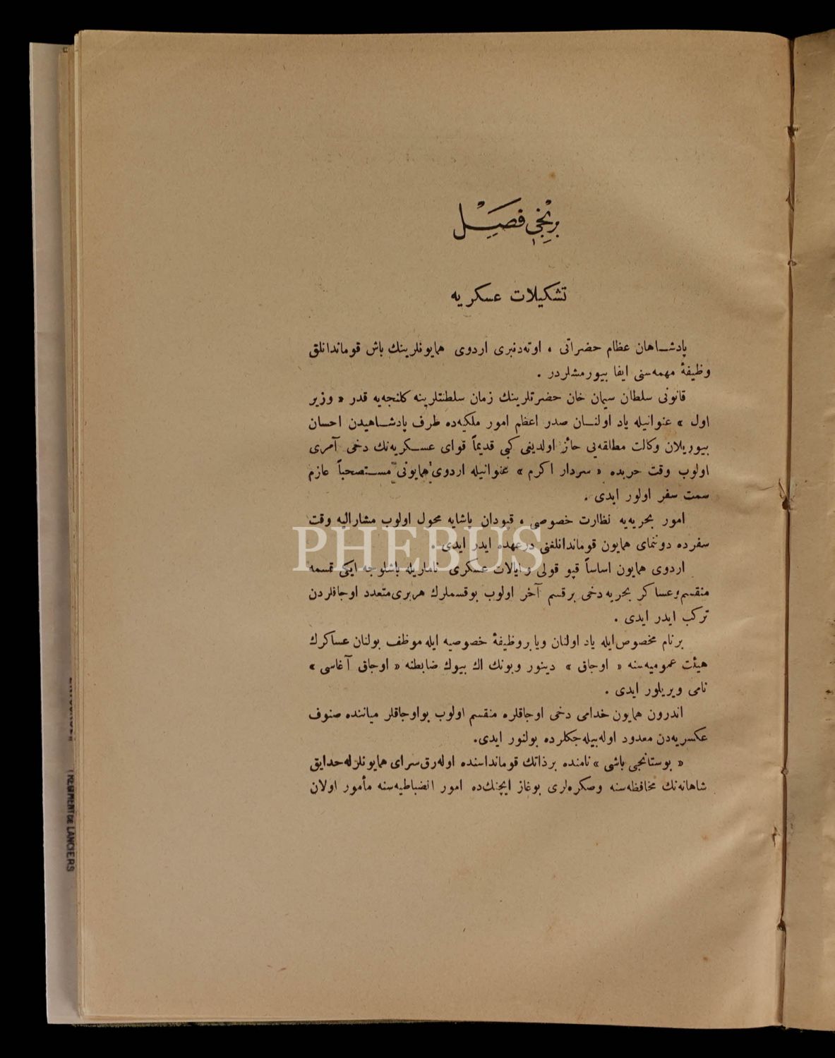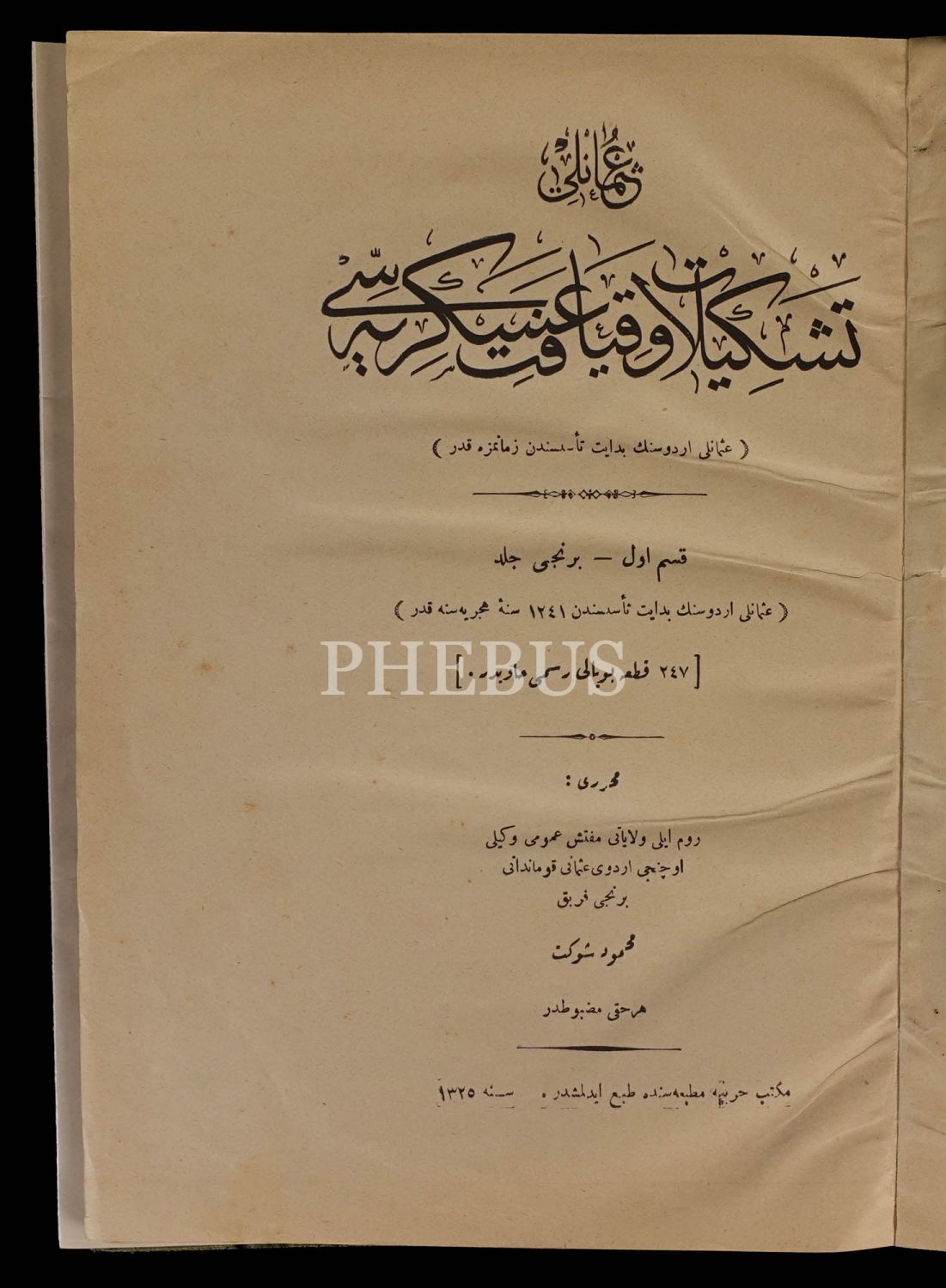 Mahmut Şevket Paşa, Tophane-i Amire Tecrübe ve Muayene Dairesi Reis Vekili olduğu dönemde hazırladığı bu eserde, Osmanlı İmparatorluğu’nun kuruluşundan 1909 tarihine kadar olan dönem içinde Osmanlı askerî teşkilatını ve askerî kıyafetleri çok ayrıntılı bir biçimde anlatmıştır. 20 orijinal planş içeren kitabın ek kısmındaki planşlar (16 adet) fotokopidir.