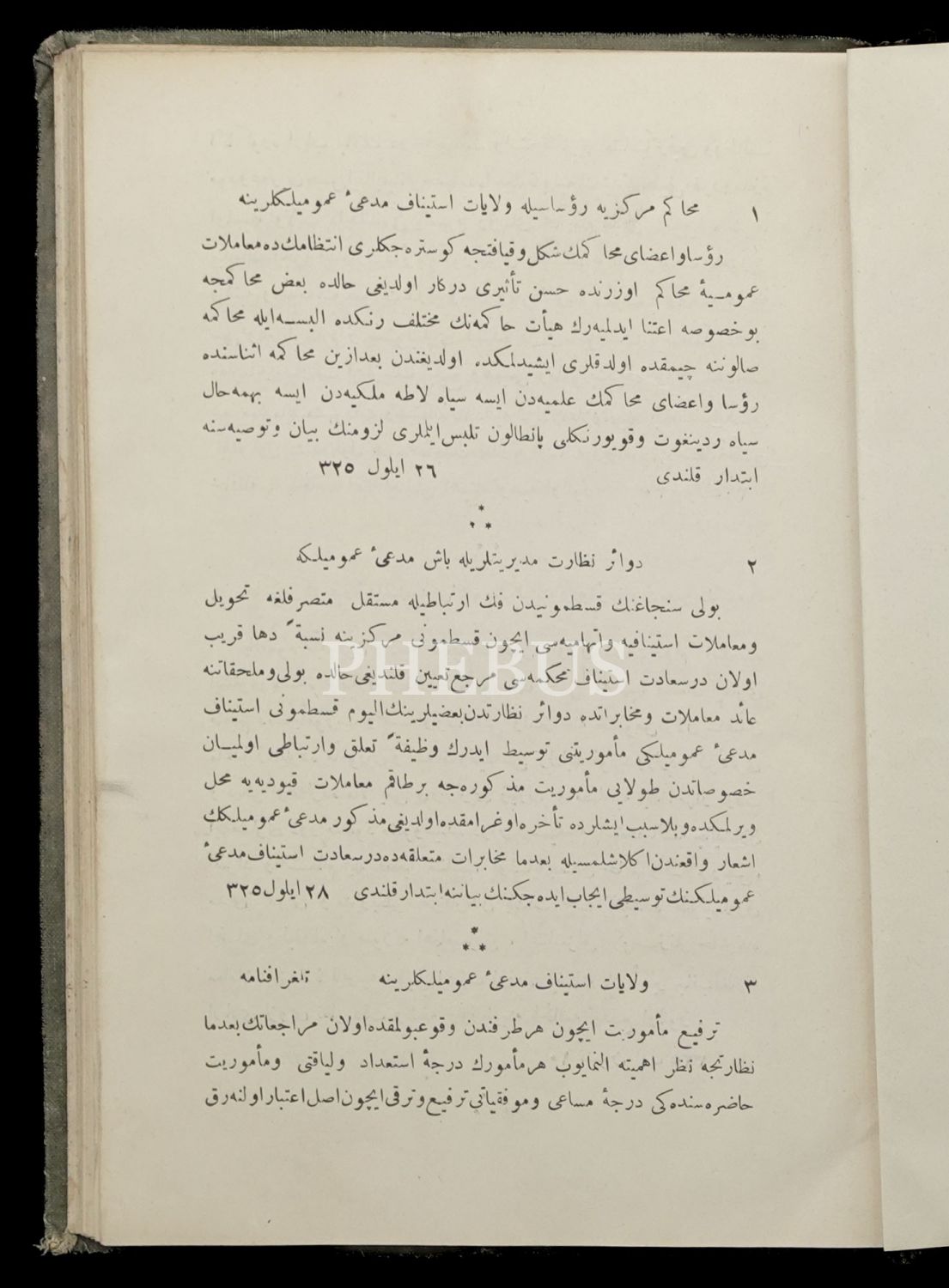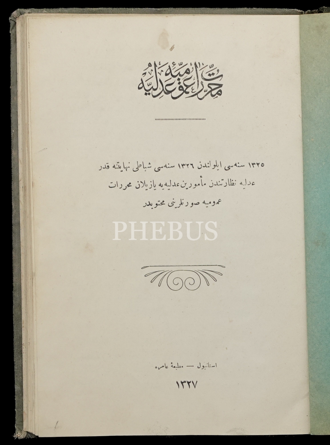 MUHARRERÂT-I UMÛMİYE-İ ADLİYE (1325 Senesi Eylülünden 1326 Senesi Şubatı Nihayetine Kadar Adliye Nezaretinden Memurîn-i Adliyeye Yazılan Muharrerât-ı Umûmiye Sûretlerini Muhtevidir), 1327, Matbaa-i Âmire, 204 sayfa, 17x23 cm...