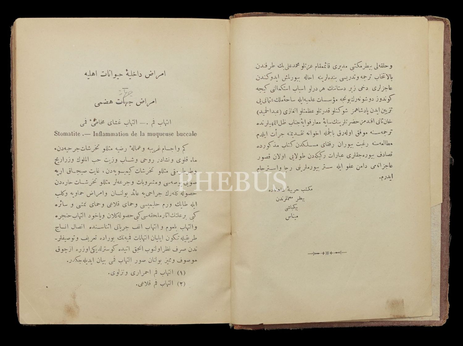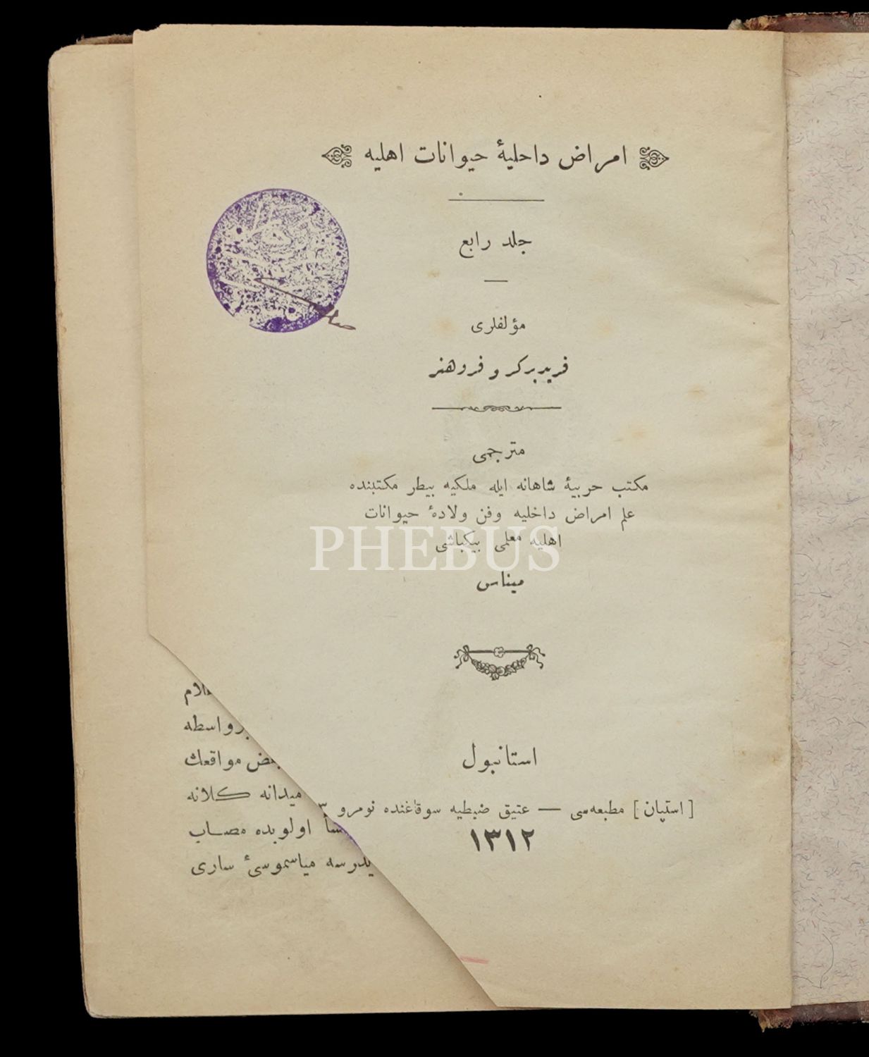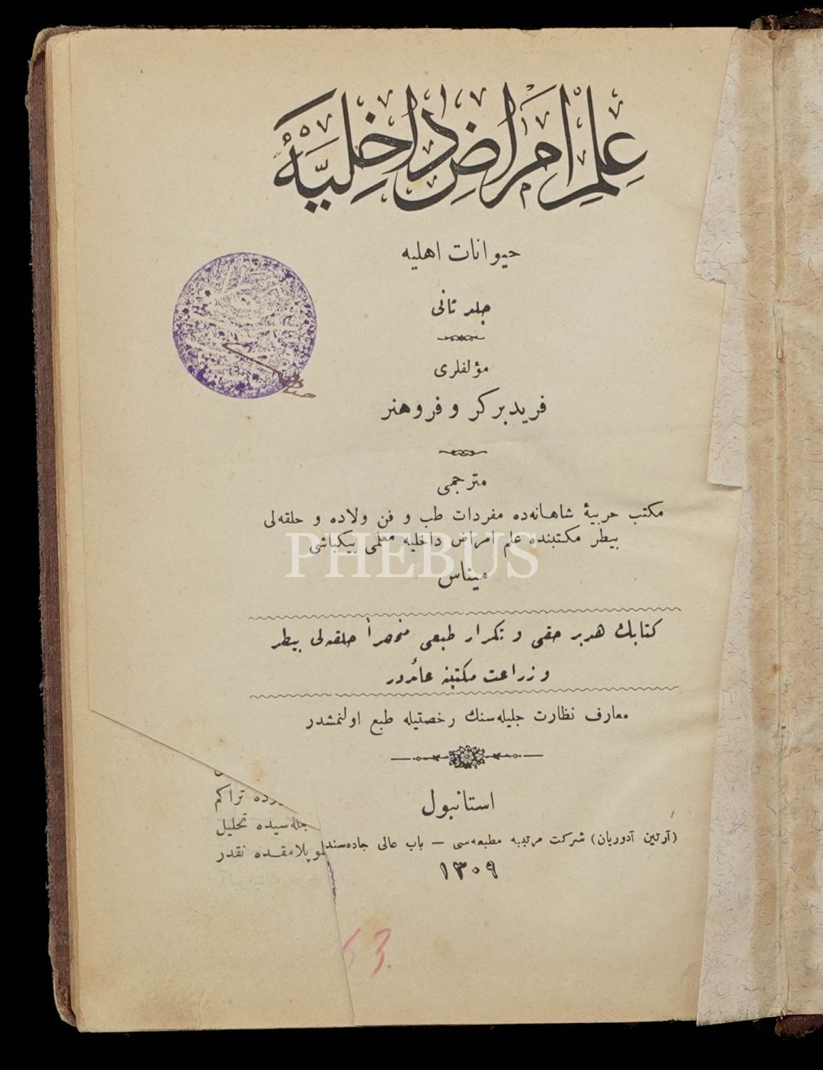 Mekteb-i Harbiye-i Şahane ile Mülkiye Baytar Mektebinde muallim binbaşı Minas tarafından çevrilmiştir. Dönem cildinde, künye sayfalarının alt köşelerinde metne ulaşmayan kesik mevcuttur.