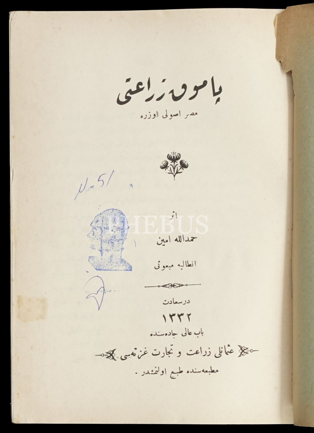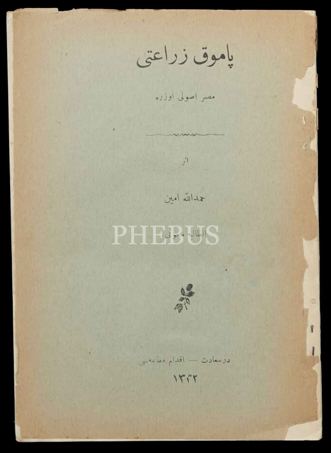 PAMUK ZİRAATİ, (Mısır Usûlü Üzere), Hamdullah Emin, 1332, Osmanlı Ziraat ve Ticaret Gazetesi Matbaası, 51 sayfa, 14x20 cm...
