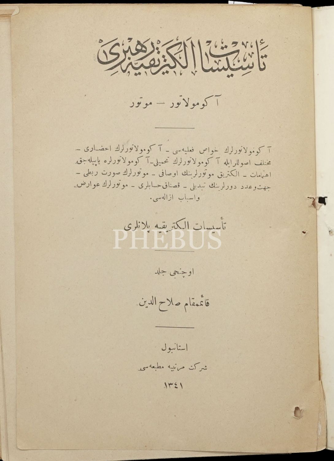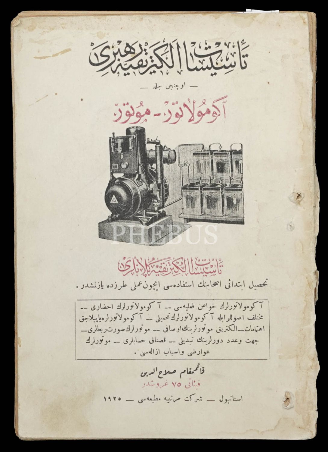 TESİSÂT-I ELEKTRİKİYE REHBERİ AKÜMÜLÂTÖR-MOTOR (Cilt: 3), Selâhaddin, 1925, Şirket-i Mürettibiye Matbaası, 132 sayfa, 15x21 cm...