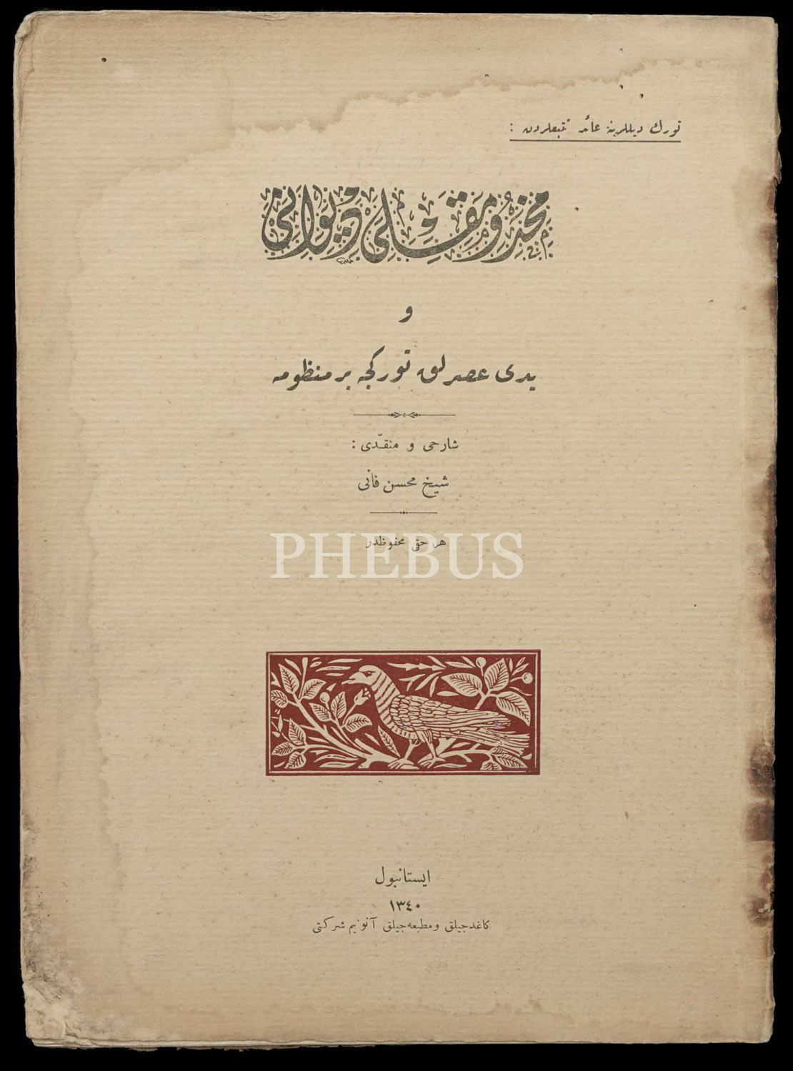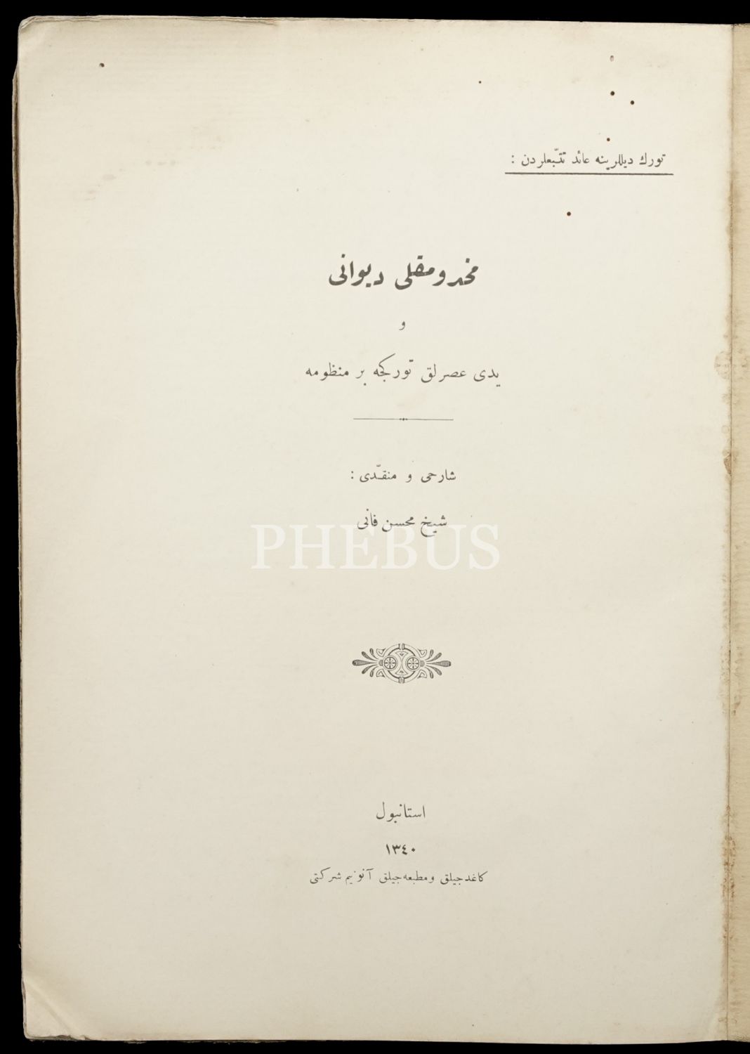 MAHDUMKULU DİVÂNI VE YEDI ASIRLIK TÜRKÇE BİR MANZUME, Mahdumkulu, Şerh ve Tenkid eden: Şeyh Muhsin Fanî (Hüseyin Kâzım Kadri), 1340, Kâğıtçılık ve Matbaacılık Anonim Şirketi, 64 sayfa, 20x28 cm...