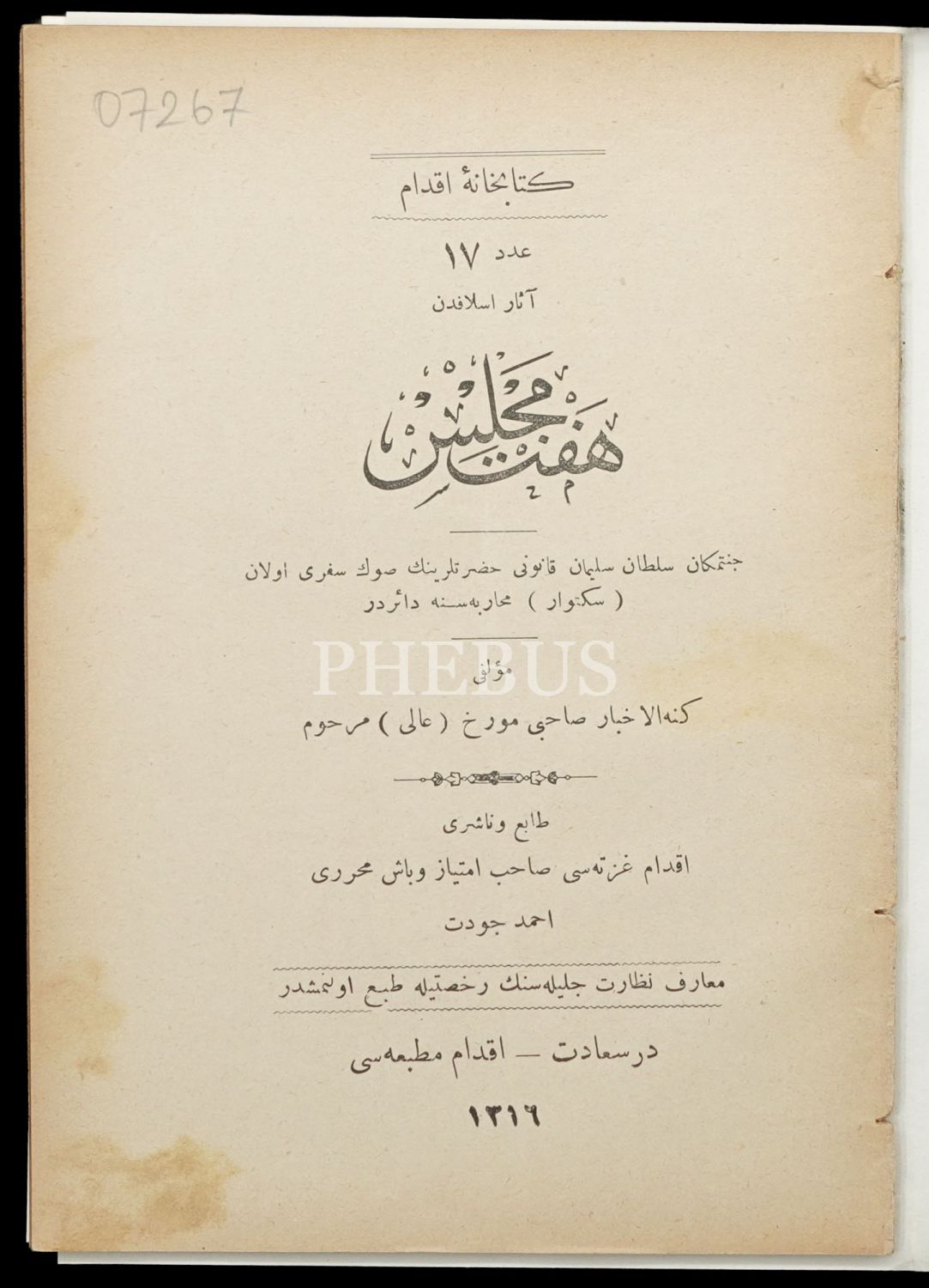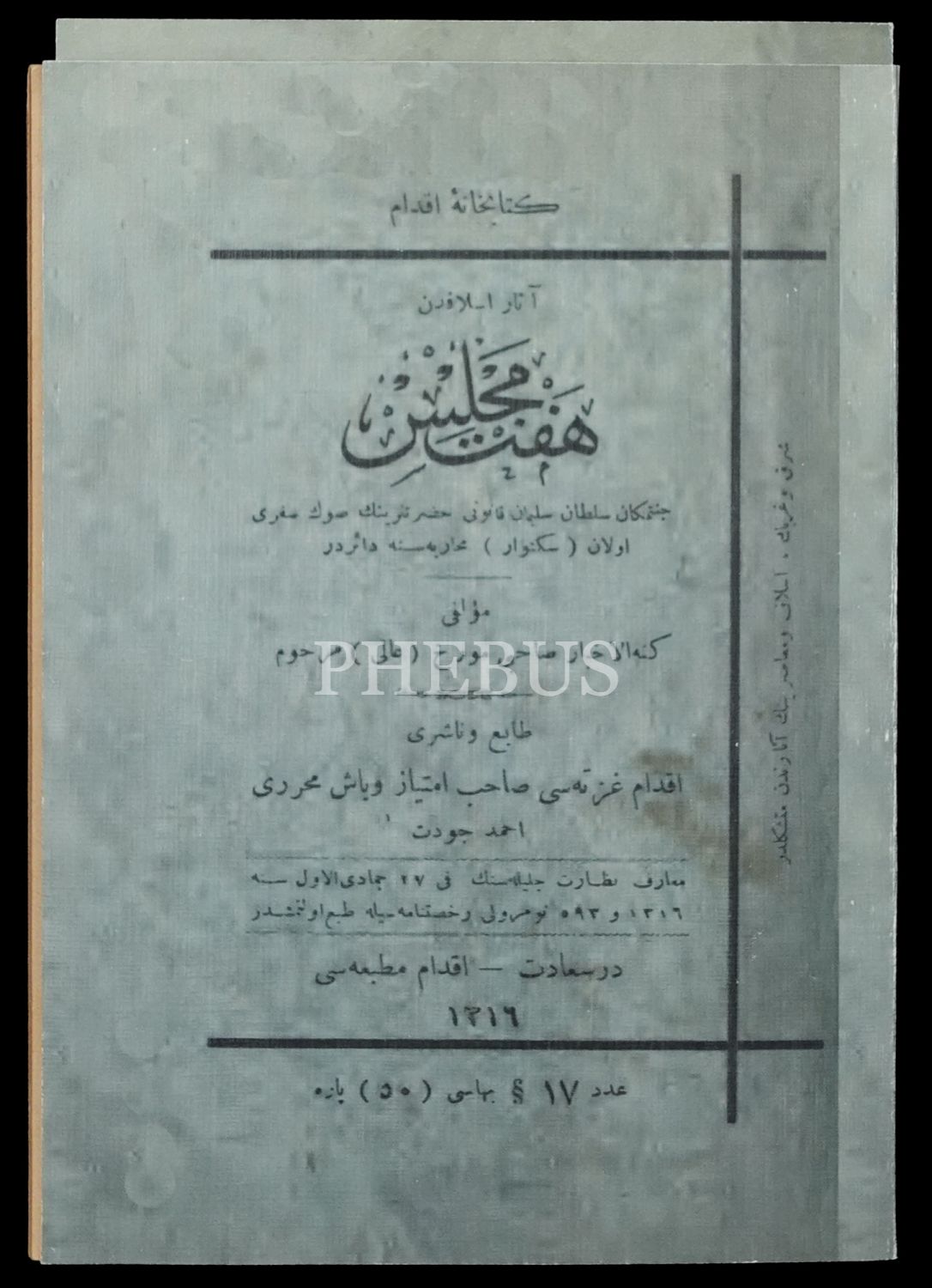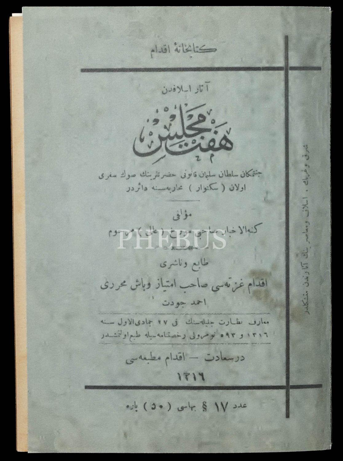 HEFT MECLİS, (Cennetmekân Sultan Süleyman-ı Kanunî Hazretlerinin Son Seferi Olan Zigetvar Muharebesine Dairdir), Gelibolulu Mustafa b. Ahmed Alî, 1316, İkdam Matbaası, 55 sayfa, 14x20 cm...