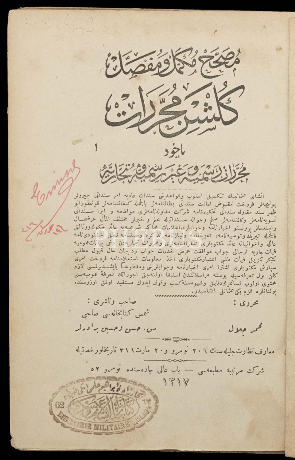 MUSAHHAH, MÜKEMMEL VE MUFASSAL GÜLŞEN-İ MUHARRERÂT YAHUD MUHARRERÂT-I RESMİYE VE GAYR-İ RESMİYE VE TİCARİYE, Mehmed Celal, 1317, Şirket-i Mürettibiye Matbaası, 311 sayfa, 15x20 cm...