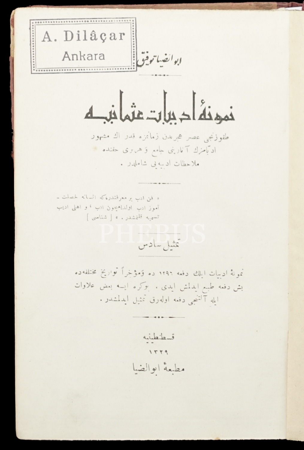 NÜMUNE-İ EDEBİYAT-I OSMANİYE, Ebüzziya Tevfik, 1329, Matbaa-i Ebüzziya, 544 sayfa, 14x19 cm...