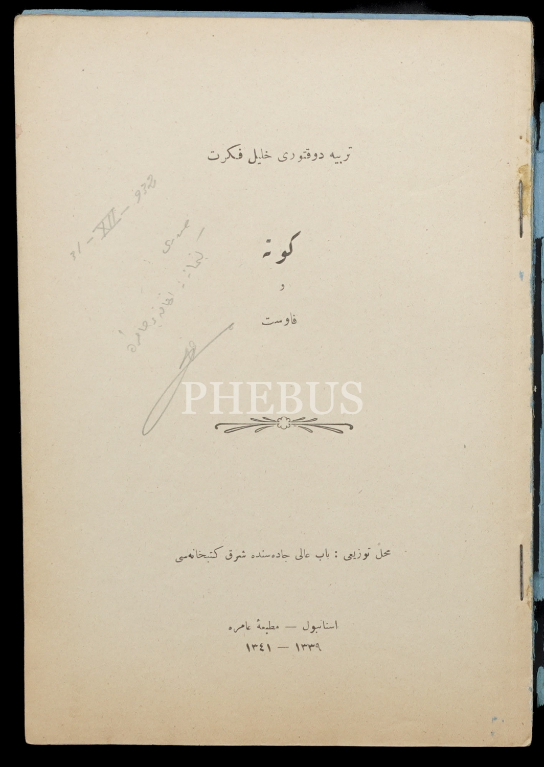 GOETHE VE FAUST, Halil Fikret [Kanad], 1339, Matbaa-i Âmire, 68 sayfa, 18x24 cm...