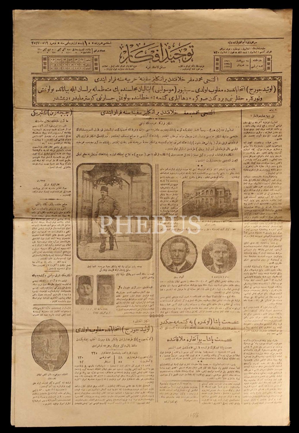 "Altıncı Mehmed, Makar-ı Hilafet´den bir İngiliz sefine-i harbiyesine firar etti" manşetiyle, Sultan Vahdettin´in İstanbul´dan kaçışını konu alan TEVHİD-İ EFKAR gazetesi, 18 Kasım 1922, 4 sayfa, 43x65 cm...