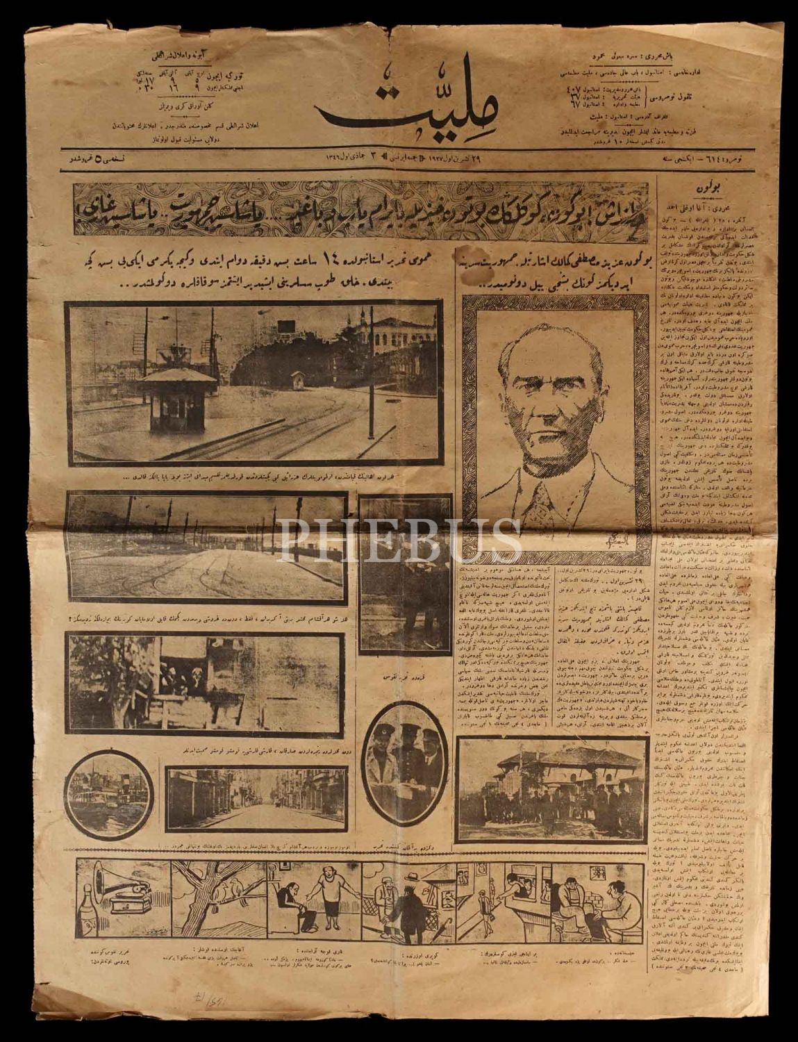 Cumhuriyet'in ilanının 4. yıldönümünü "Vatandaş! Bugün gönlünün bütün hazzıyla bayram yap ve bağır: Yaşasın Cumhuriyet, yaşasın Gazi!" manşetiyle kutlayan, 29 Ekim 1927 tarihli Milliyet gazetesi… Atatürk portresinin üstünde "Bugün, Aziz Mustafa Kemal'in işaretiyle Cumhuriyet sırrına erdiğimiz günün beşinci (beşinci yıla girildiği için olsa gerek) yıldönümüdür." yazısı yer alıyor. Birinci sayfada ve iç sayfalarda ayrıca 28 Ekim 1927'de yapılan, Türkiye Cumhuriyeti'nin ilk nüfus sayımı ile ilgili haber ve fotoğraflar var.