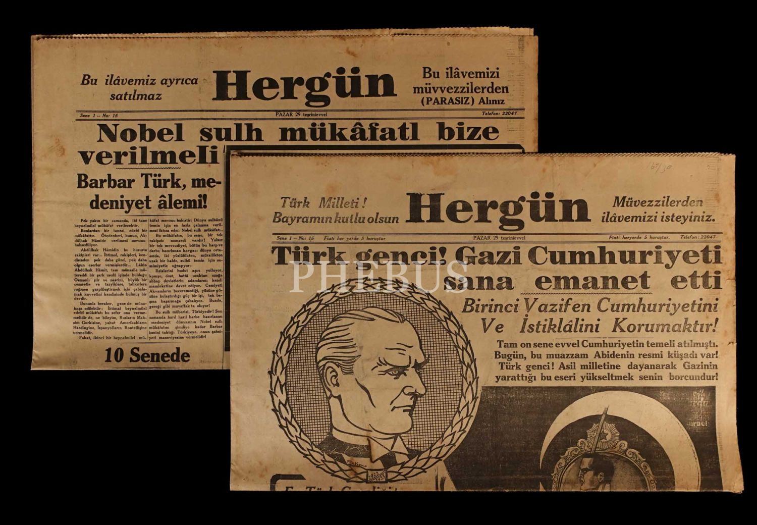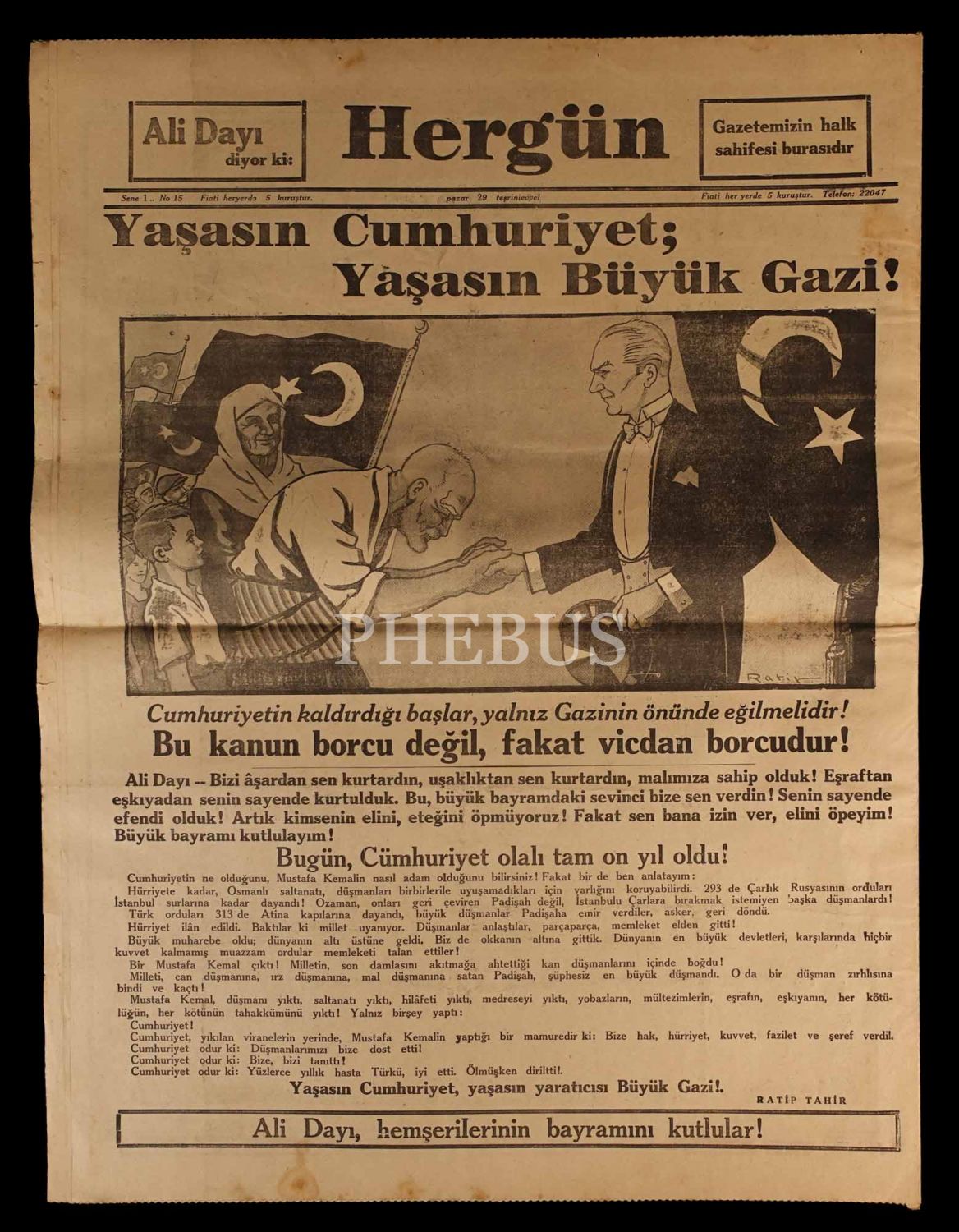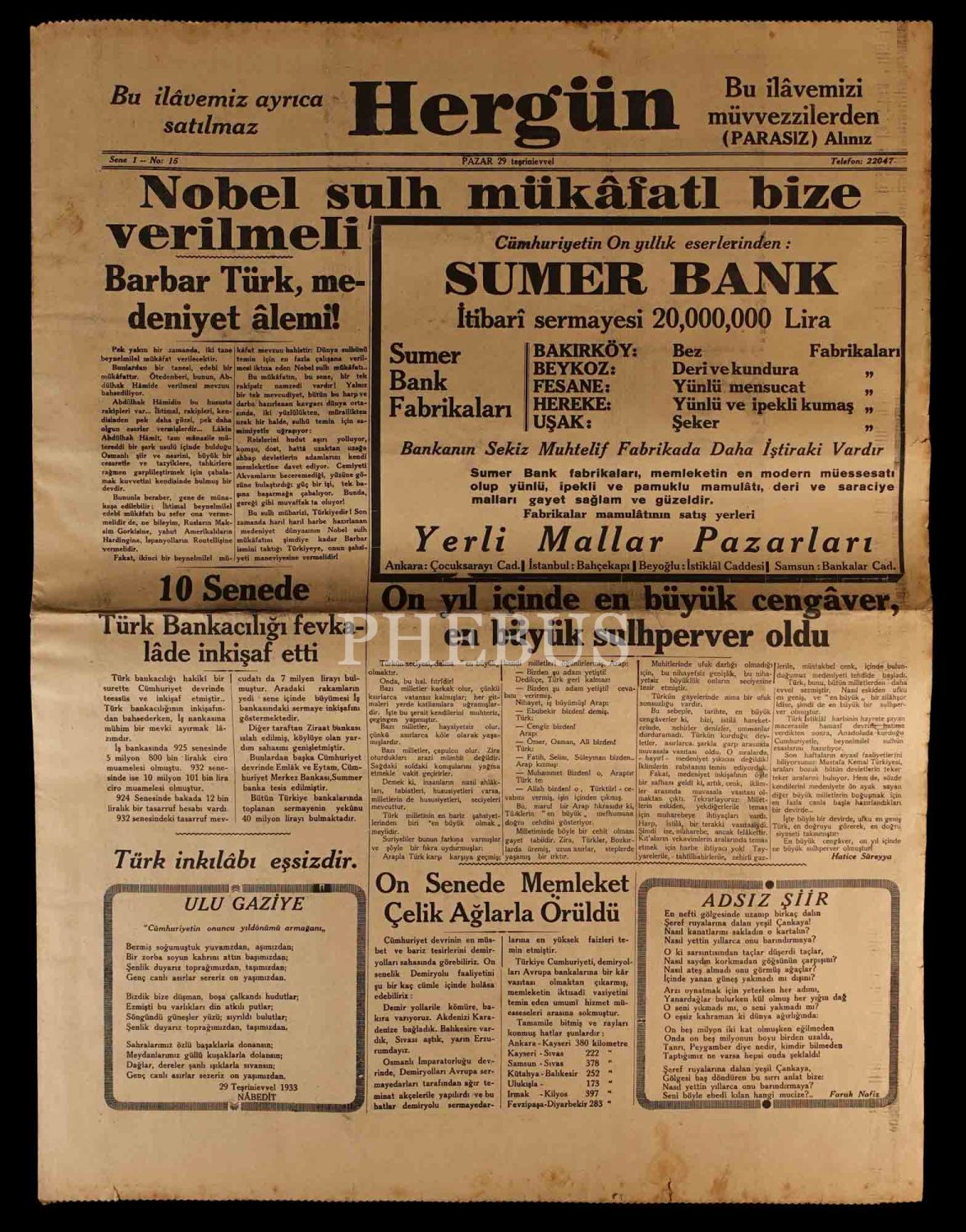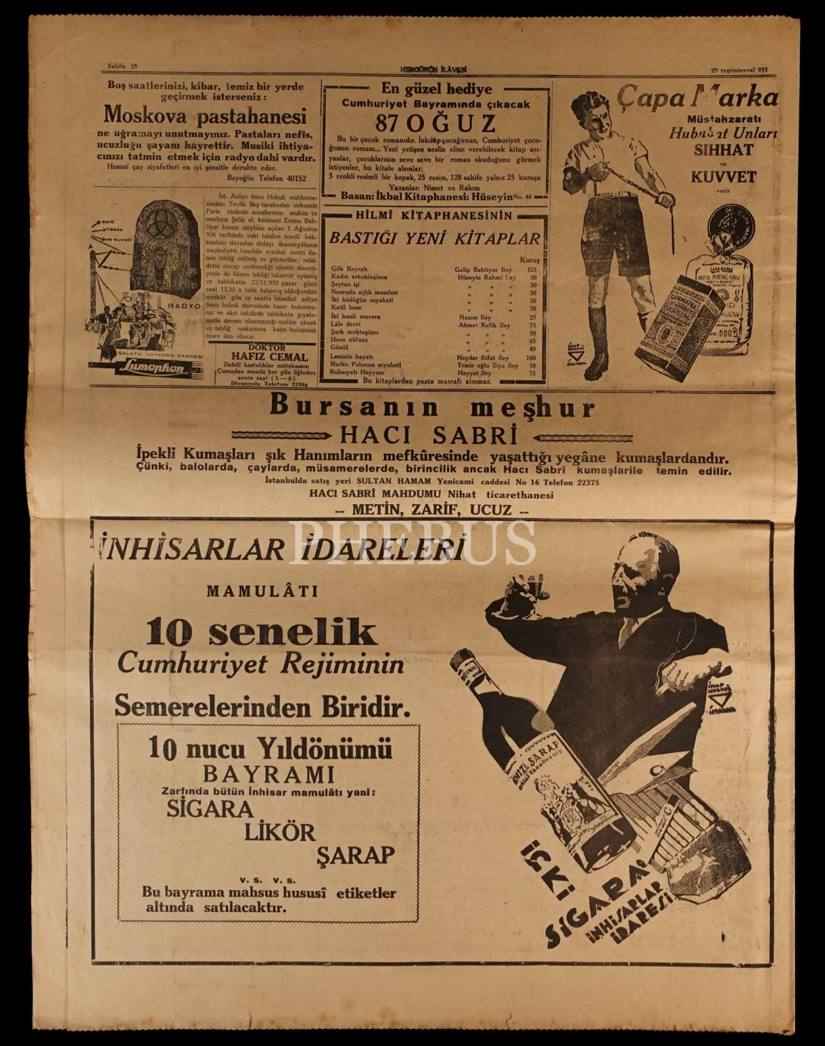 Cumhuriyet´in kuruluşunun 10. yıldönümünü özel ilavesiyle birlikte HERGÜN gazetesi, 29 Ekim 1933, 18 sayfa, 45x60 cm...