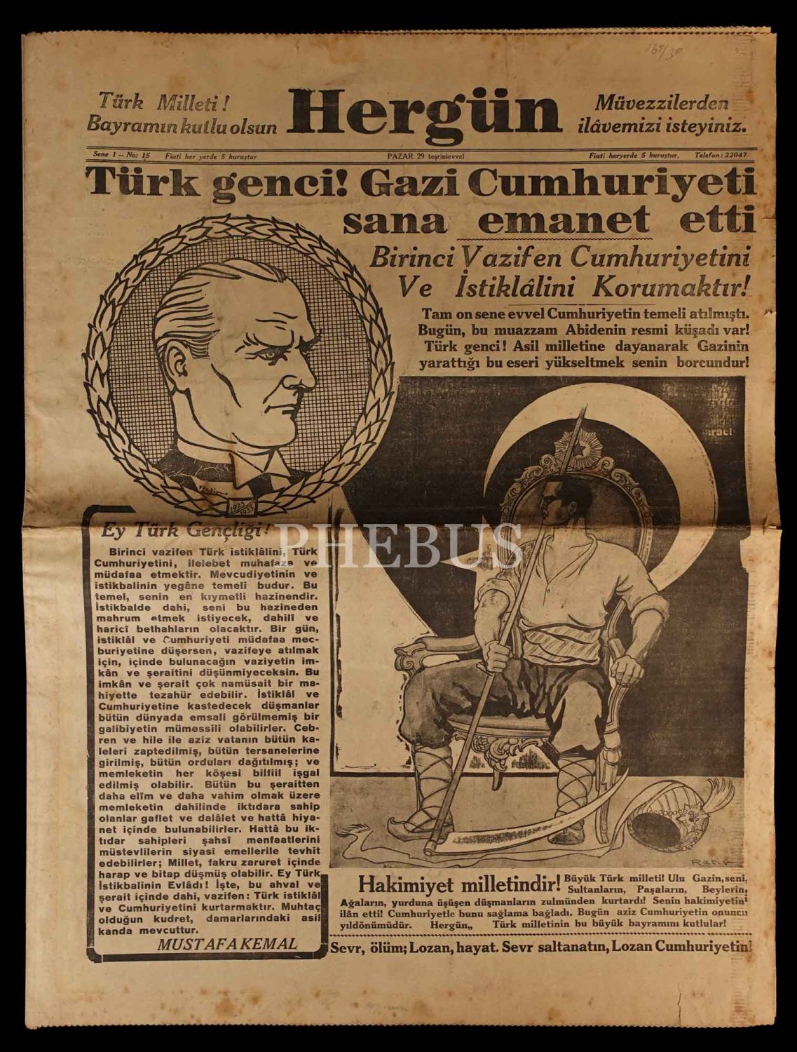 Gazetenin birinci sayfasında, padişahlığı simgeleyen kavuğu ayağının altına almış ve elindeki tırpanıyla padişahın tahtına oturmuş Türk genci çizimi, ilavede Atatürk'ün elini öpen bir ihtiyar çiziminin altında "Cumhuriyet'in kaldırdığı başlar, yalnız Gazi'nin önünde eğilmelidir. Bu kanun borcu değil fakat vicdan borcudur." yazısı ve "Nobel sulh mükâfatı bize verilmeli" manşeti yer almaktadır.
