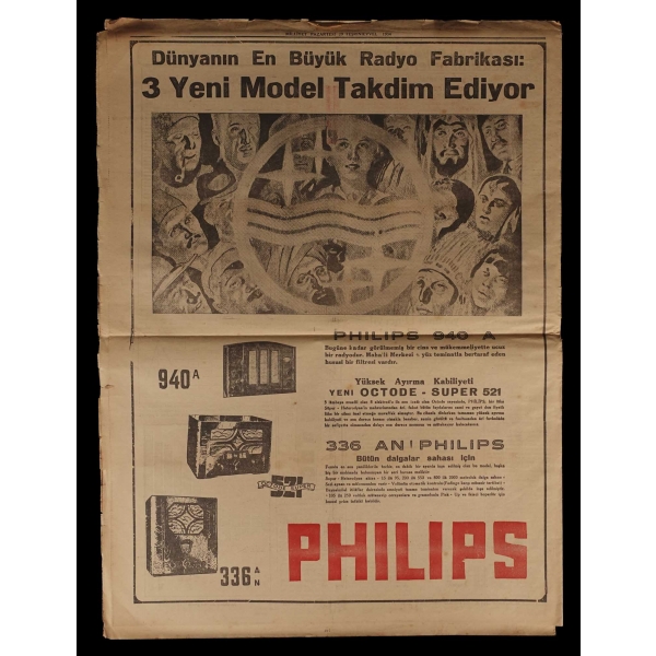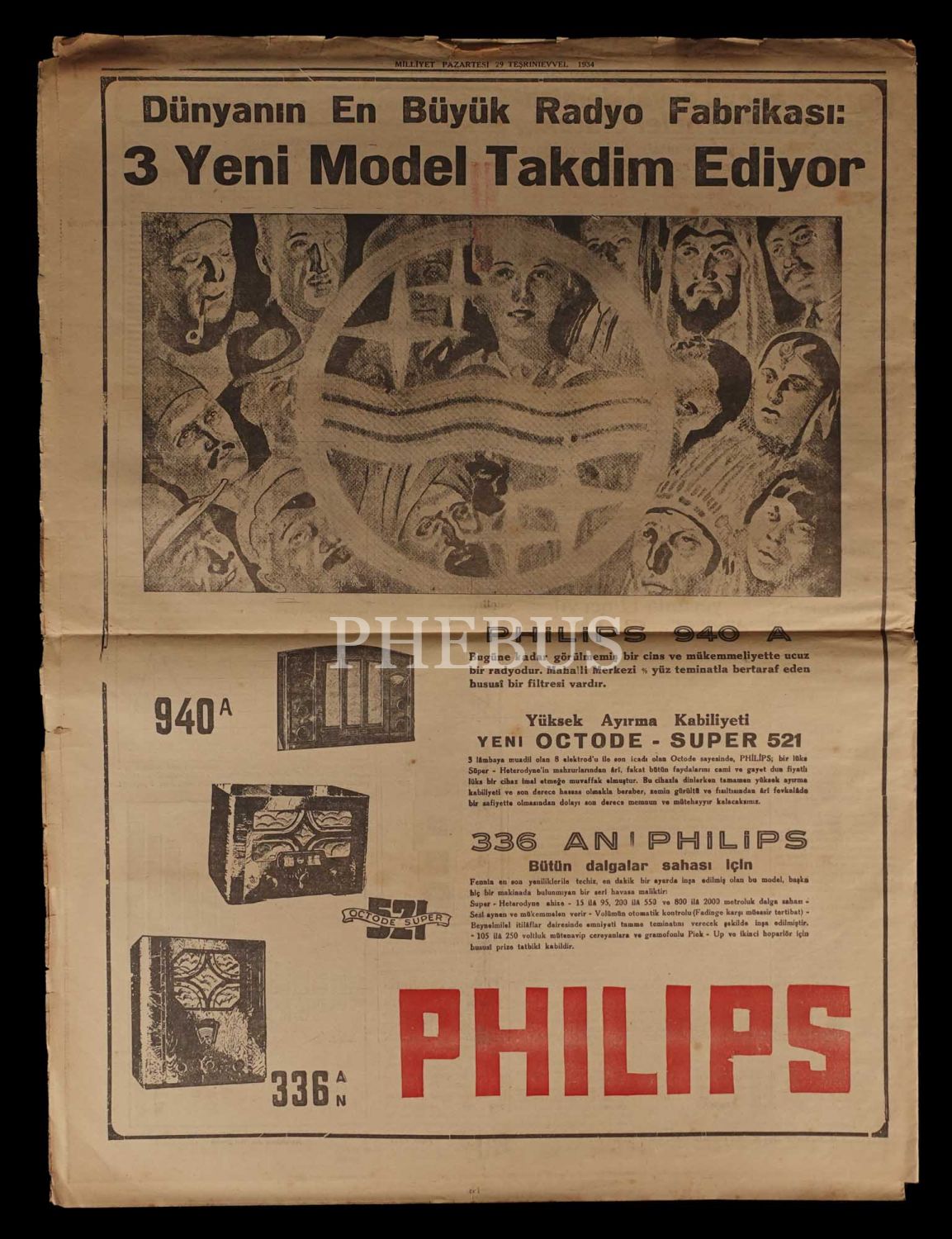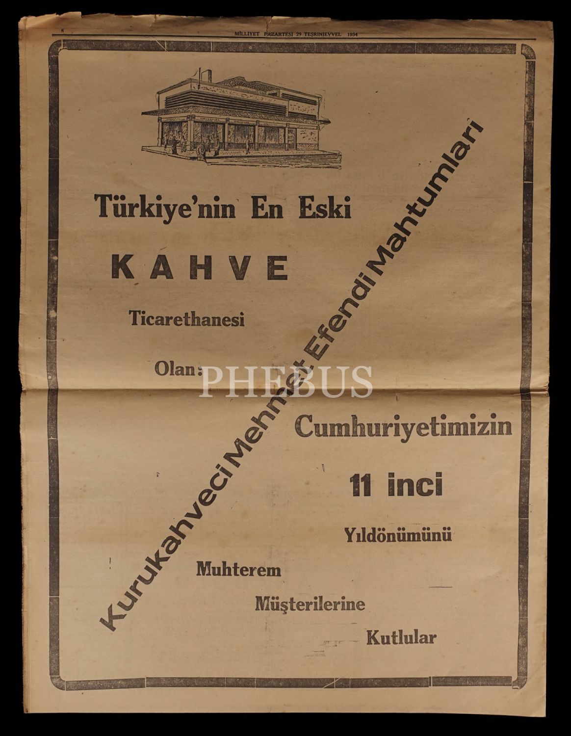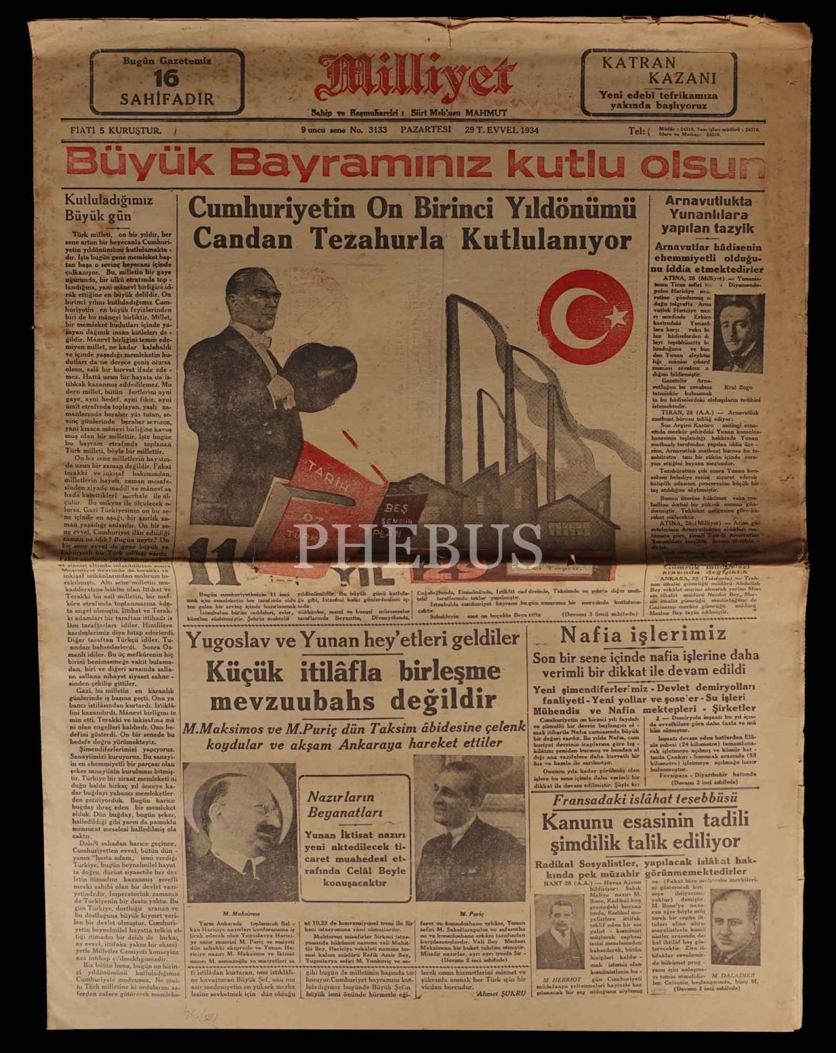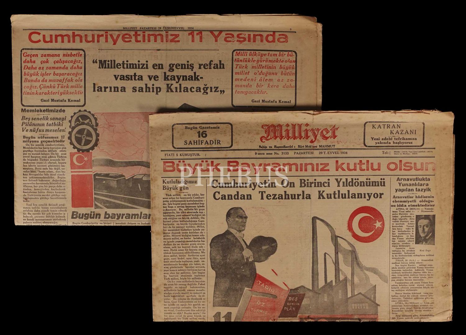 "Büyük Bayramınız kutlu olsun" manşetiyle, Cumhuriyet´in ilanının 11. yıldönümü kutlamalarını konu alan MİLLİYET gazetesi, 47x64 cm...