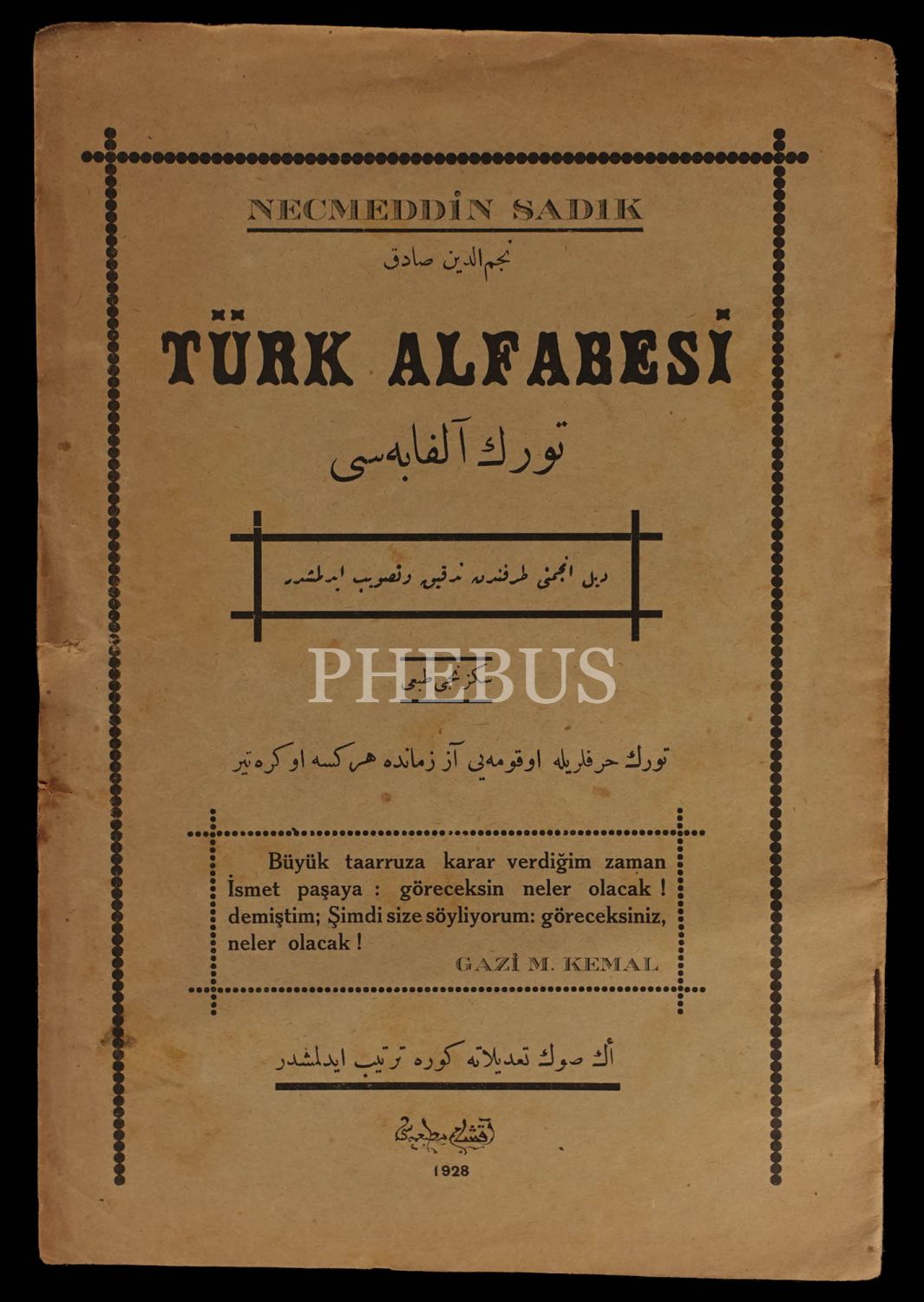 TÜRK ALFABESİ, Necmeddin Sadık, 1928, Akşam Matbaası, 24 sayfa, 17x24 cm...