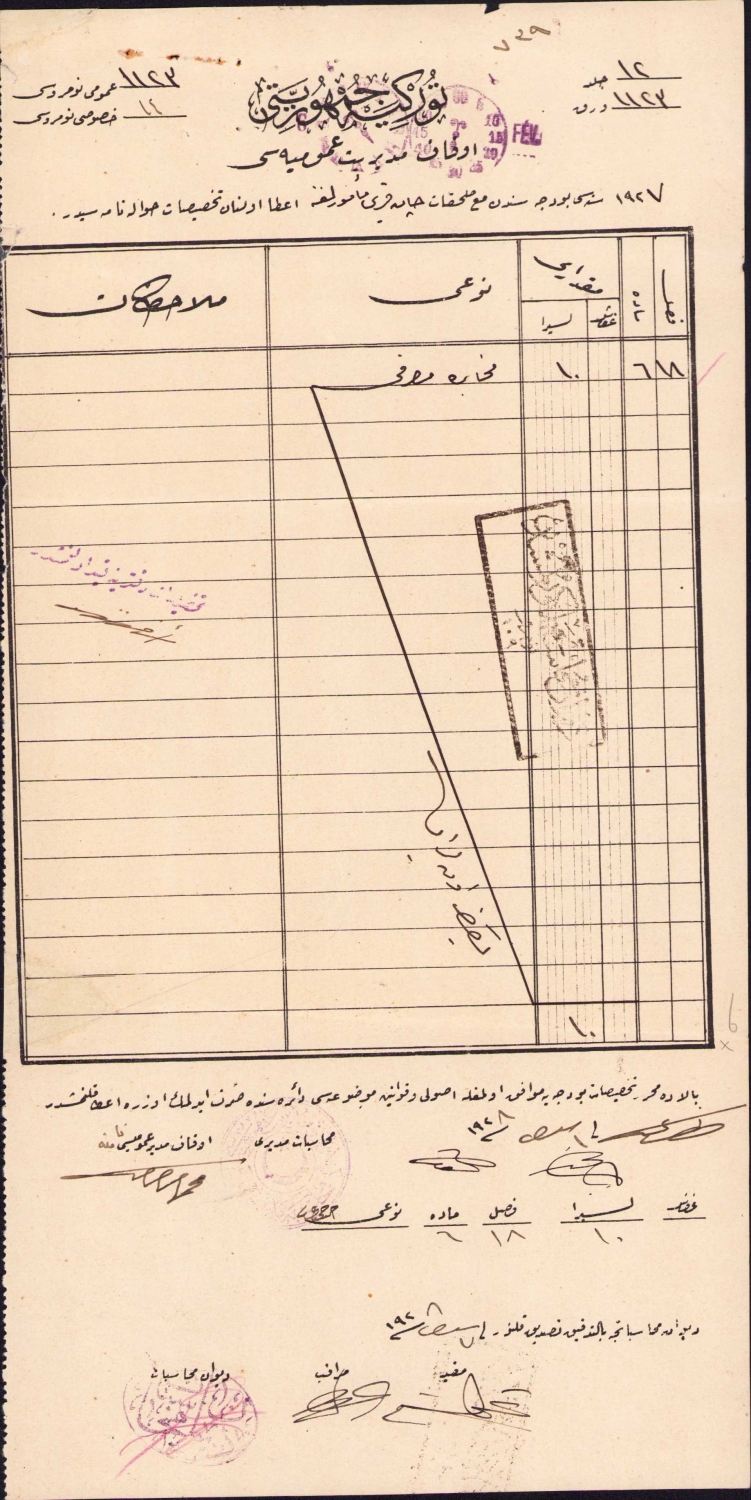 Osmanlıca Türkiye Cumhuriyeti Evkaf Müdüriyeti Umumiyesine ait makbuz, 1928 tarihli, 15x30 cm