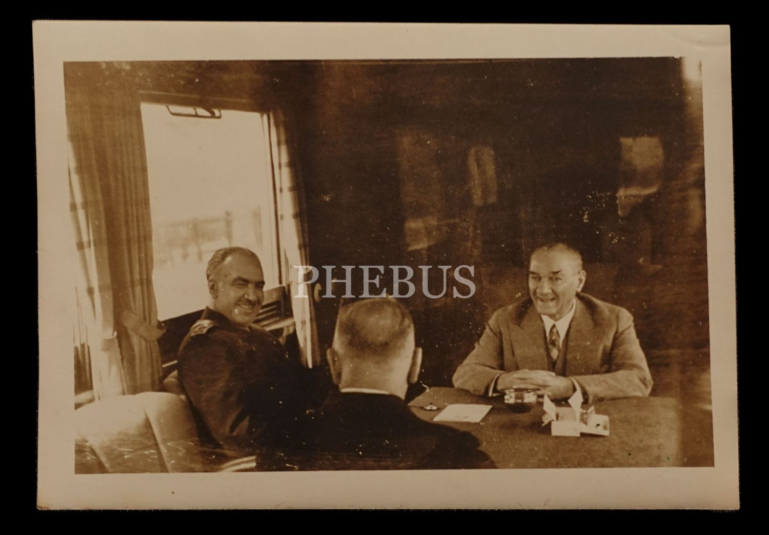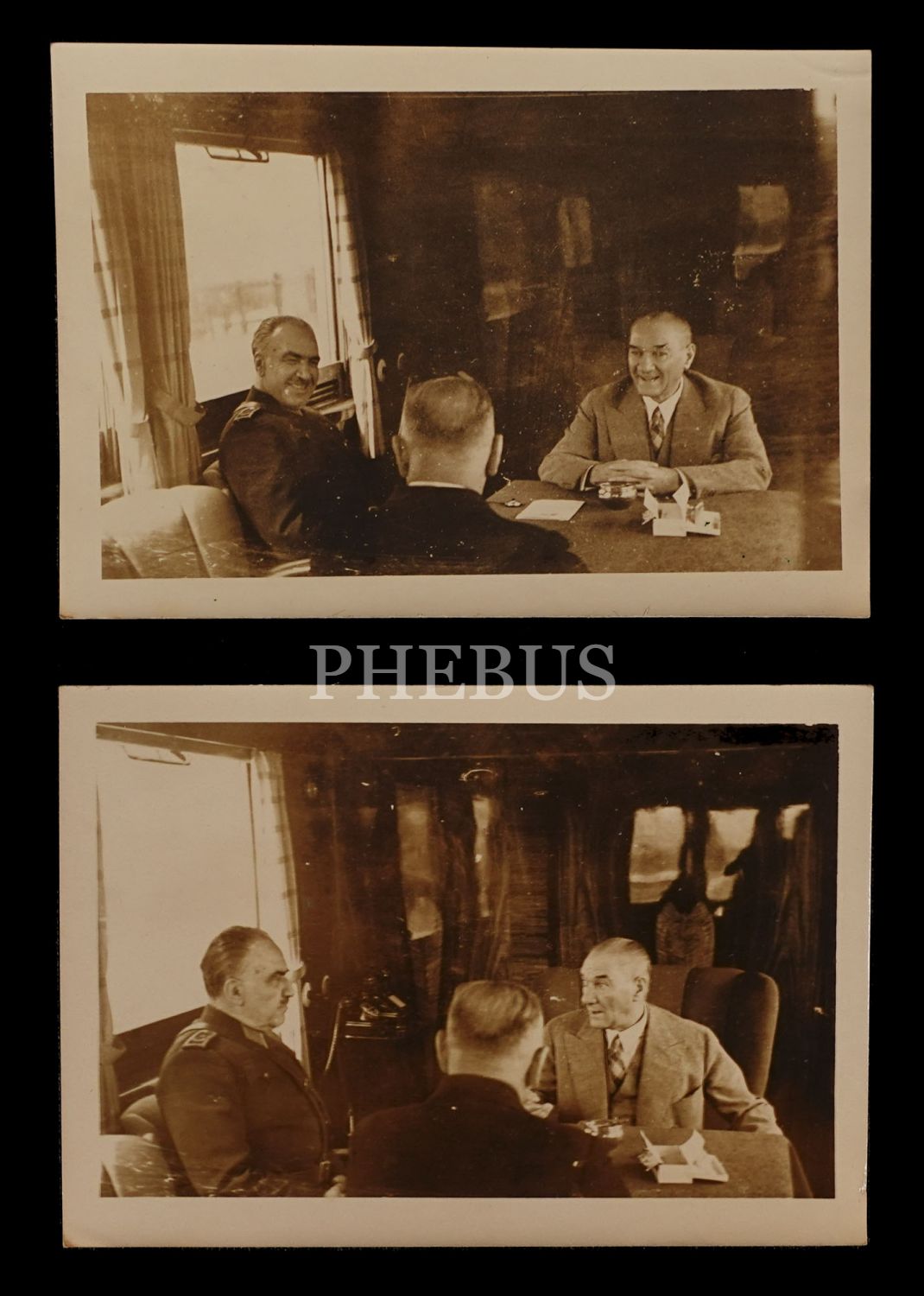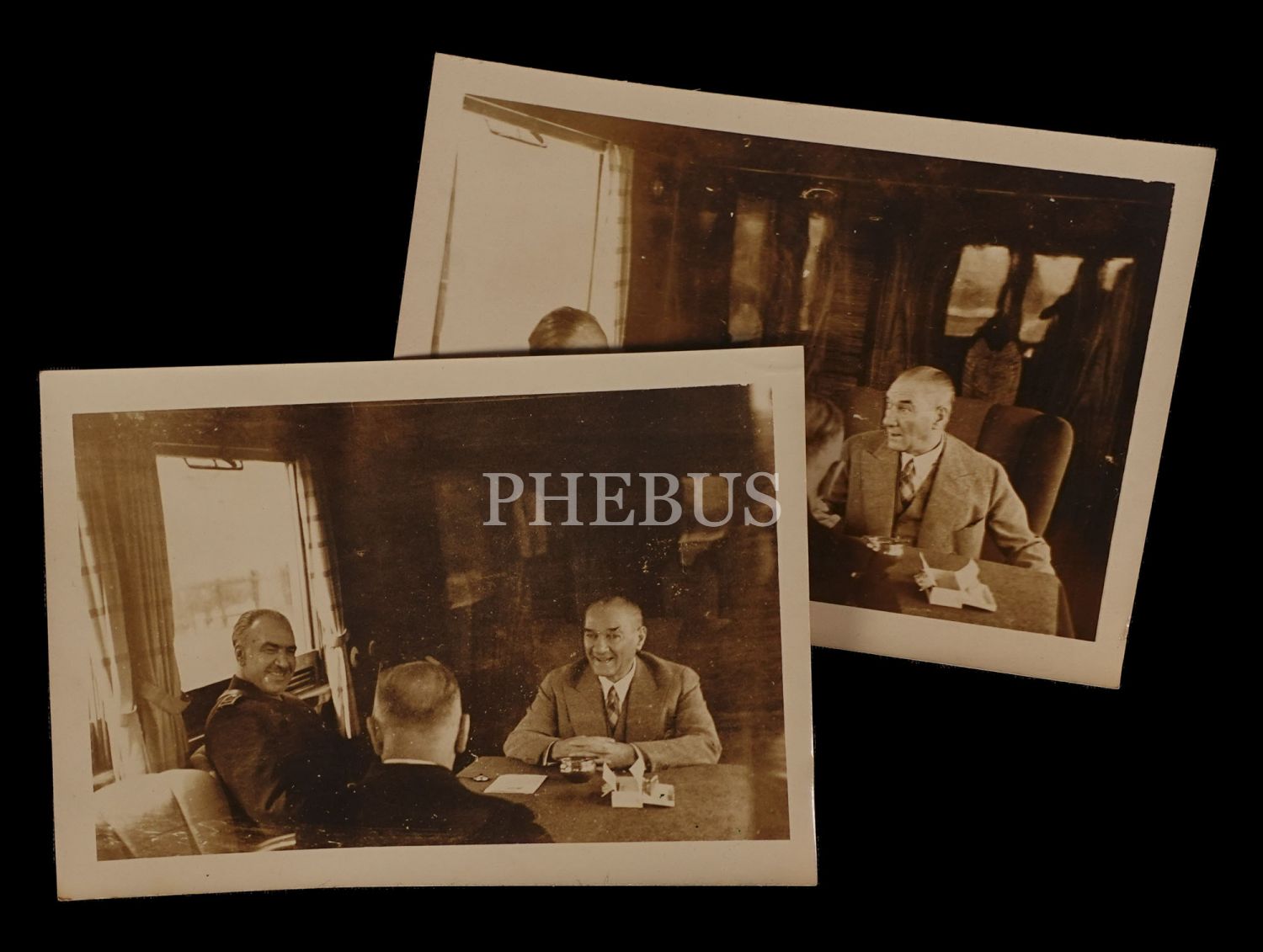 Mustafa Kemal Atatürk, Fevzi Çakmak ve Salih Bozok´un, bir tren seyahatinde keyifli bir sohbete daldıkları esnada alınmış iki adet enstantane fotoğrafı, 12x8 cm...