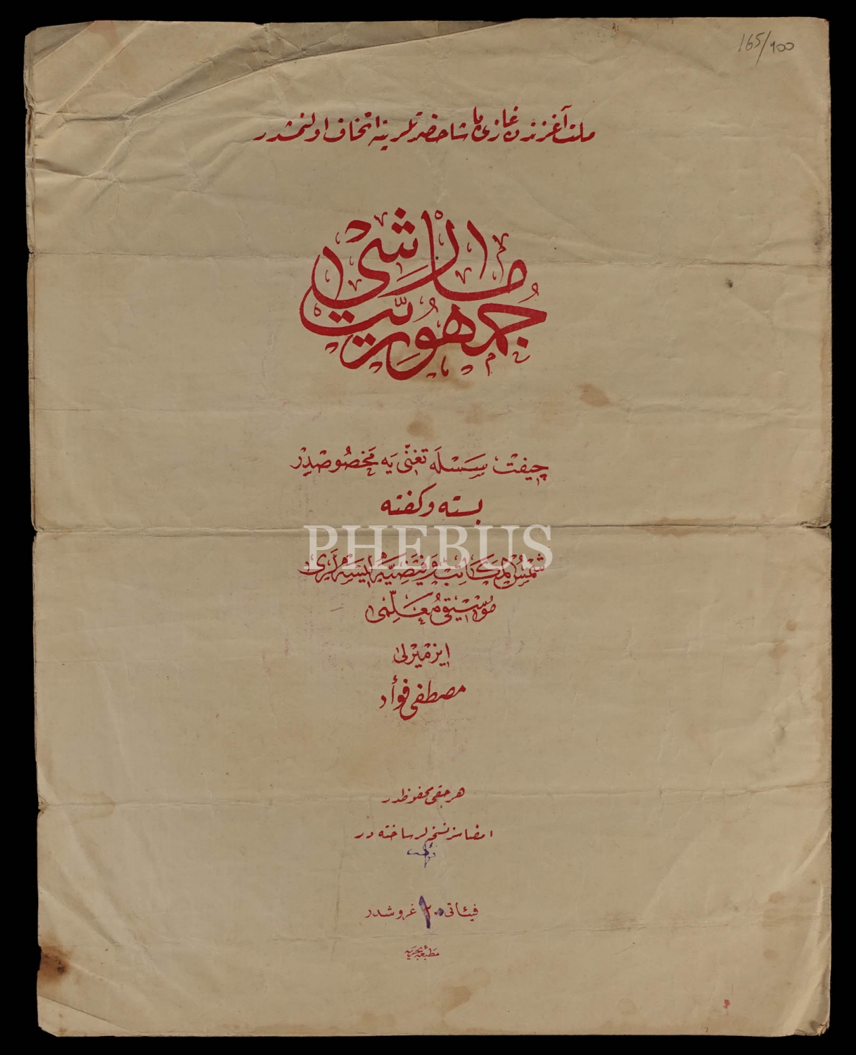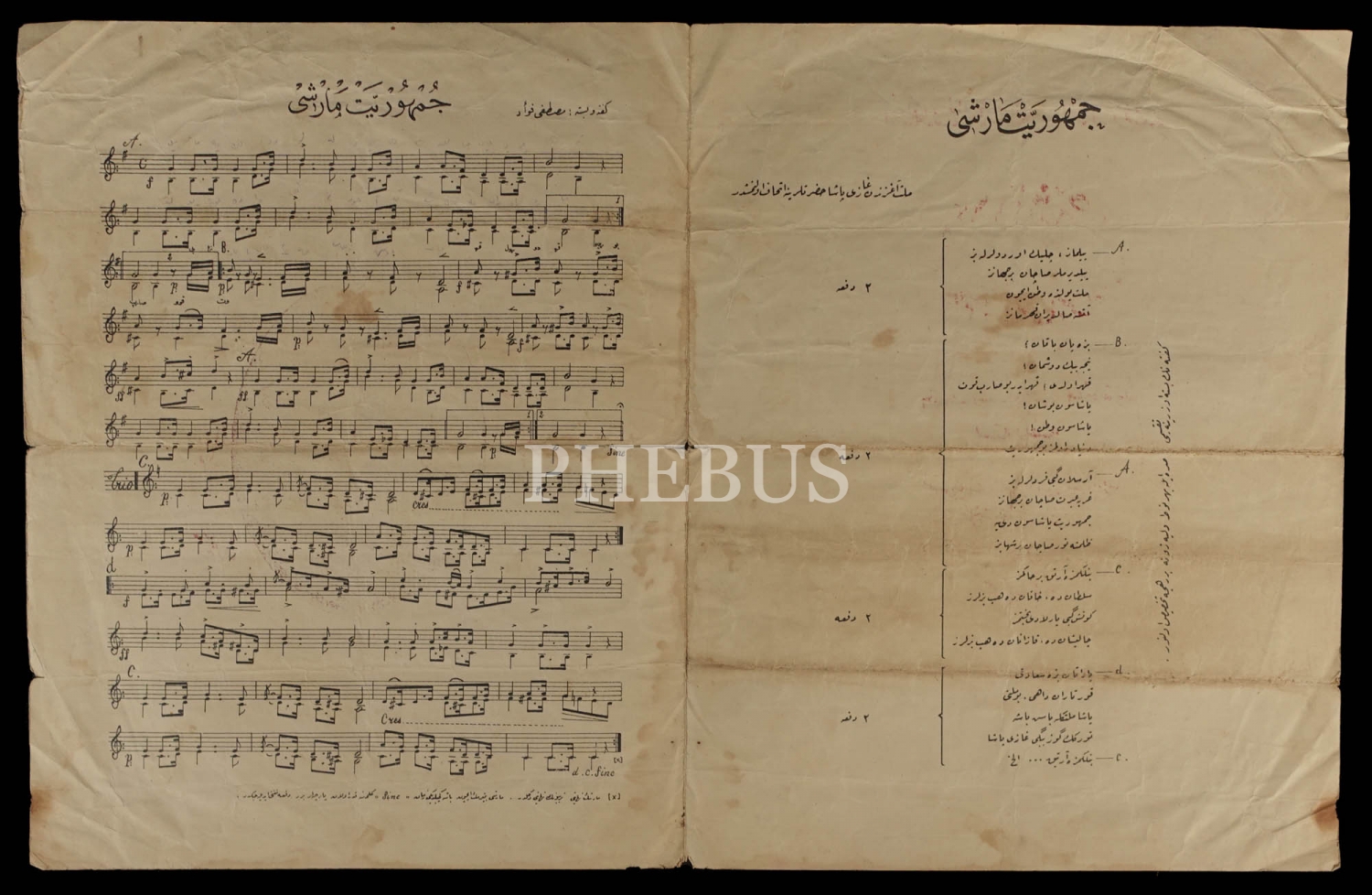 İzmirli Mustafa Fuat tarafından bestelenen Cumhuriyet Marşı, Matbaa-i Bahriye, 4 sayfa, 27x34 cm...