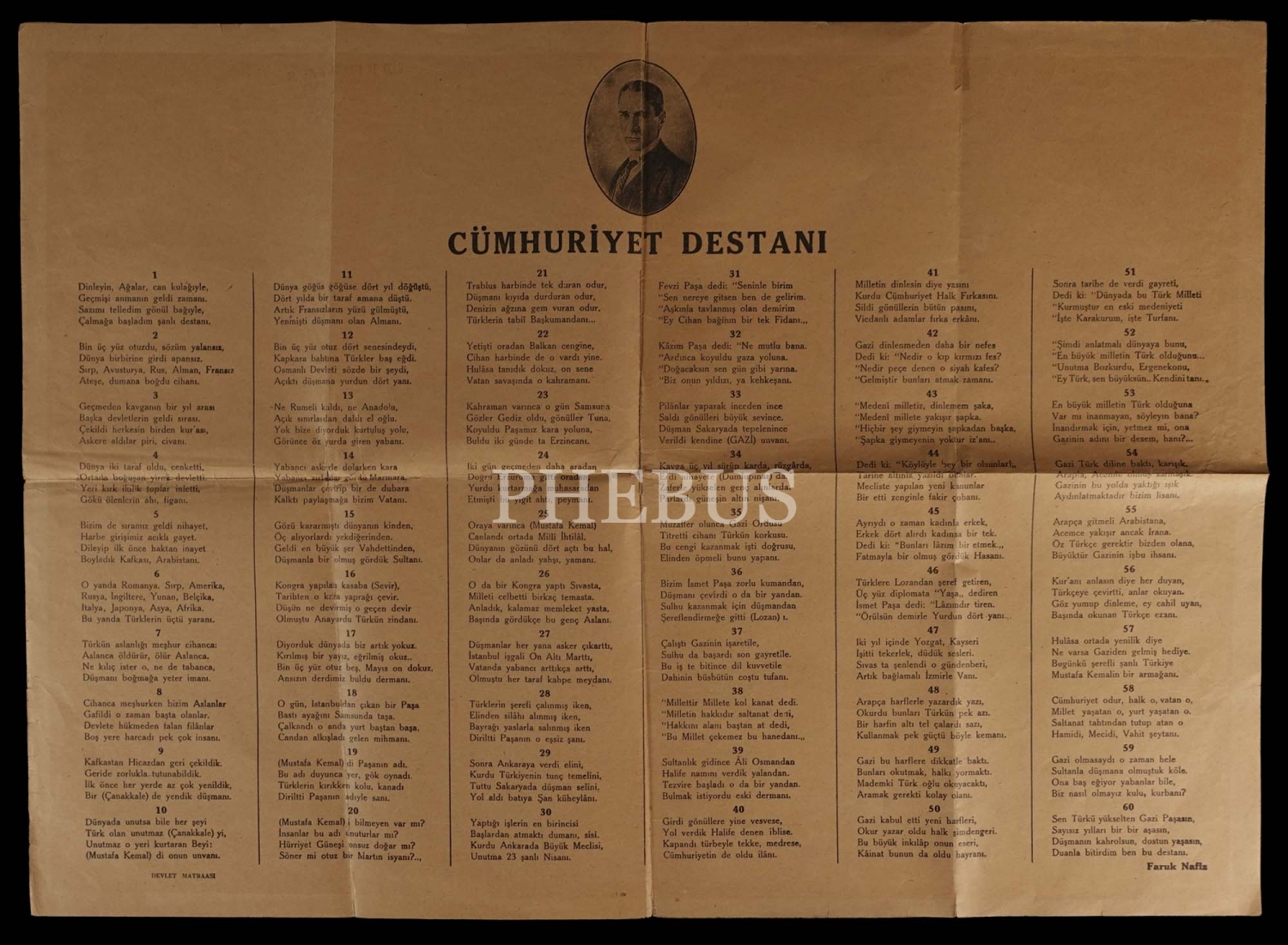 Faruk Nafiz tarafından kaleme alınan "Cümhuriyet Destanı" afişi, 57x41 cm...