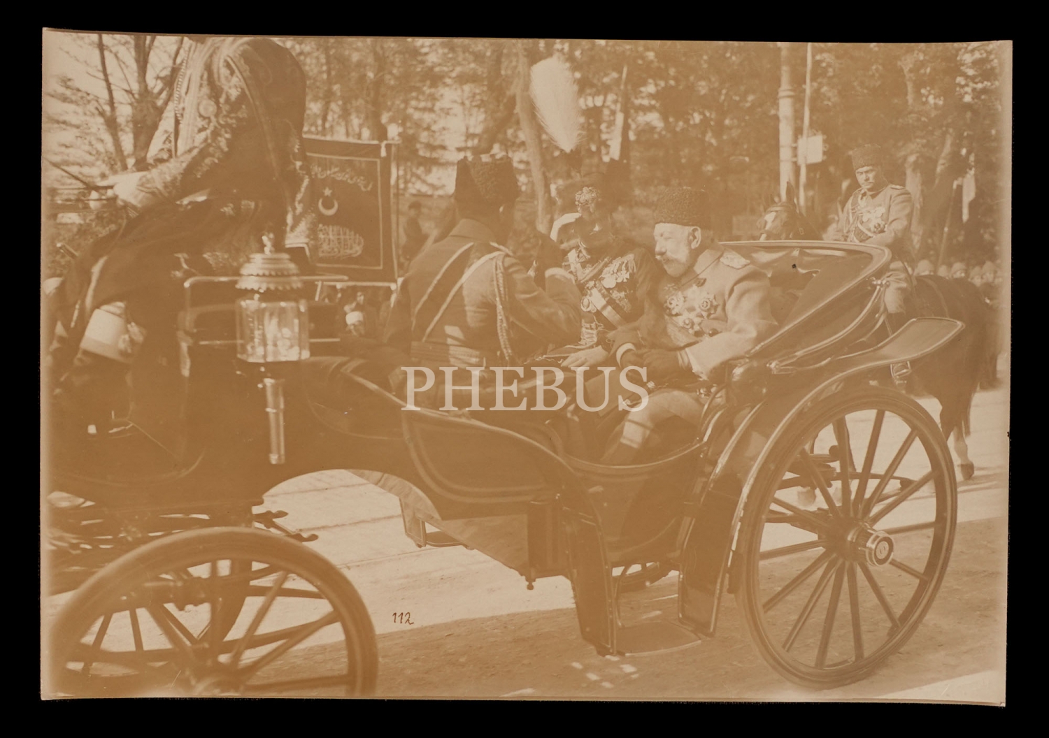 Sultan V. Mehmed Reşad, Harbiye Nazırı Enver Paşa ve Avusturya-Macaristan İmparatoru I. Karl saltanat arabası ile seyir halinde, 18x12 cm...