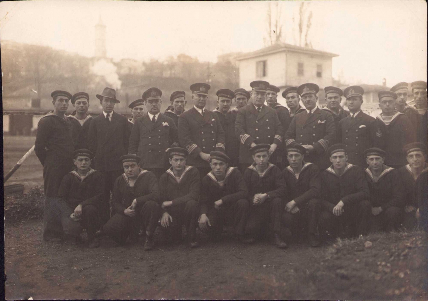 İzmit 1926 yılları arasında yavuz zırhlısı komutan yardımcısı Ziya Bey, komutanlar ve keplerinde 'TC efradı' yazılı bahriye erleri, 12x17 cm