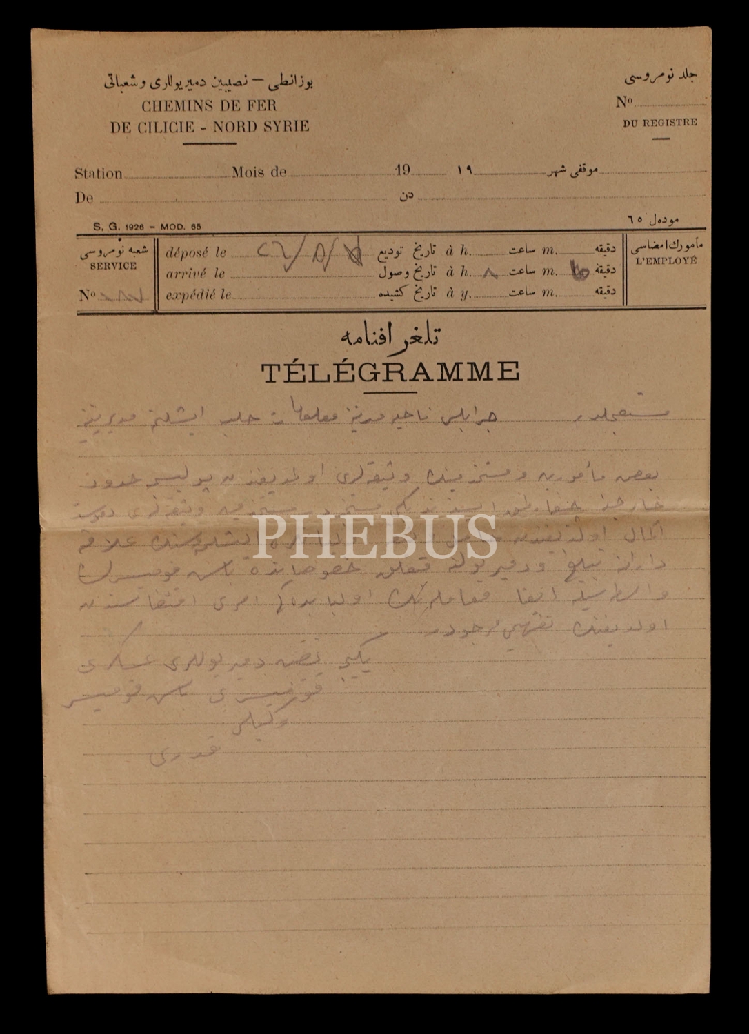 "Pozantı-Nusaybin Demiryolları ve Şubâtı" antetli, Yeni Pozantı Demiryolları Askeri Komiseri Kadri Bey´in kaleme aldığı telgraf evrakı, 17x24 cm...