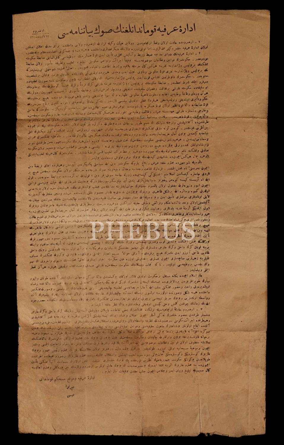 Erzurum´da yaşanan Şeyh Sait İsyanı üzerine ilan edilen, "İdare-i Örfiye Kumandanlığının Son Beyannaemesi" başlıklı idare-i örfiye (sıkıyönetim) bildirgesi, 24x41 cm...