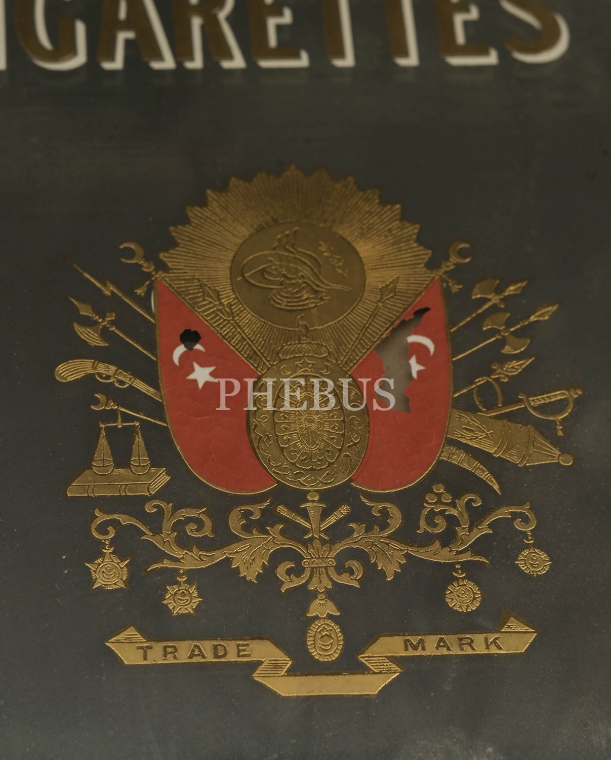 Osmanlı İmparatorluğu´nun tütün tekeli Reji İdaresi´nin, cam altında bulunan ayna yüzeyine altın yaldızlı harflerle işlenmiş reklam levhası, levha üzerinde kurumun trademark´ı olarak Sultan İkinci Abdülhamid tuğralı Osmanlı devlet arması yer almaktadır. Çerçevesiyle birlikte 68x50 cm...
