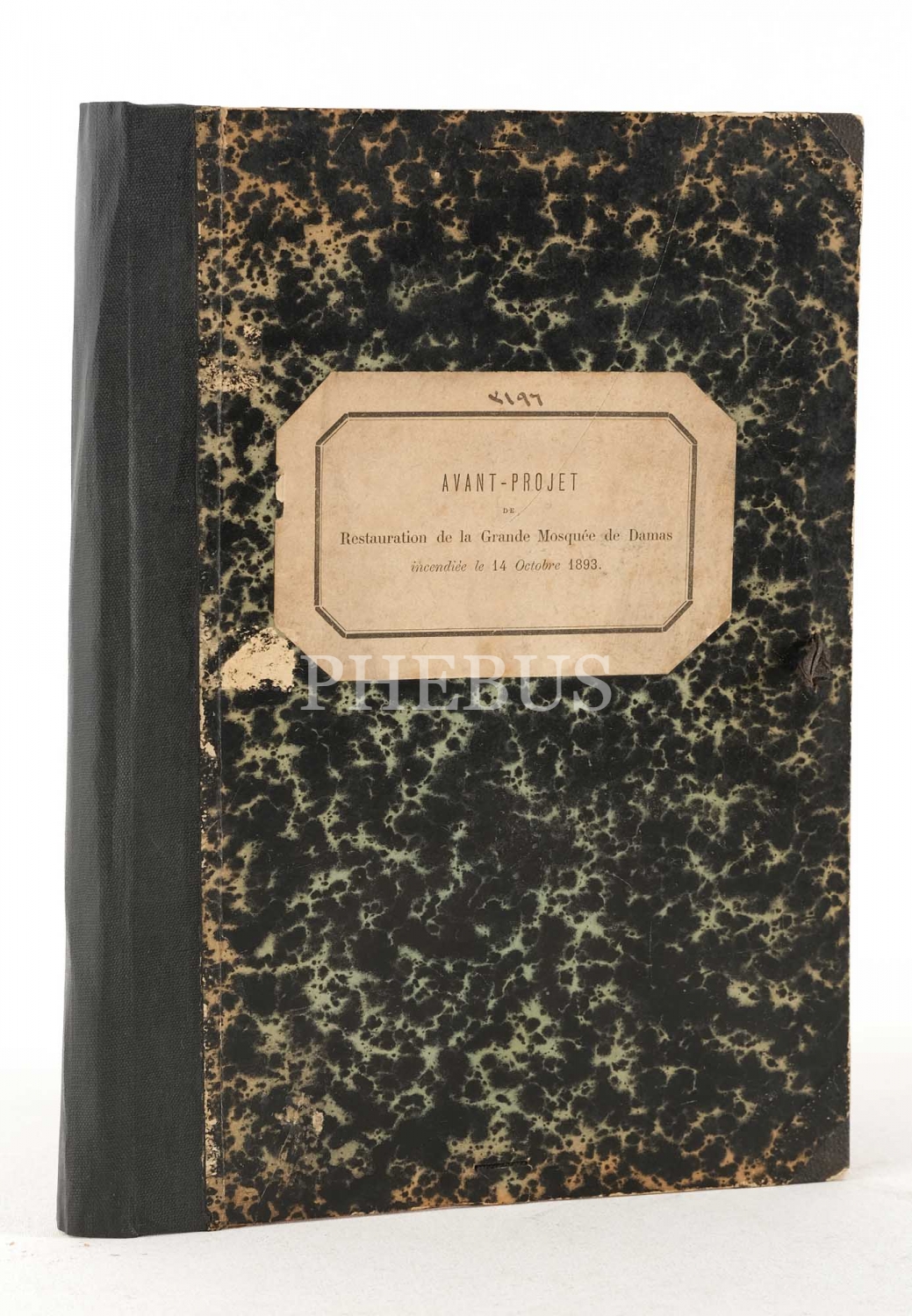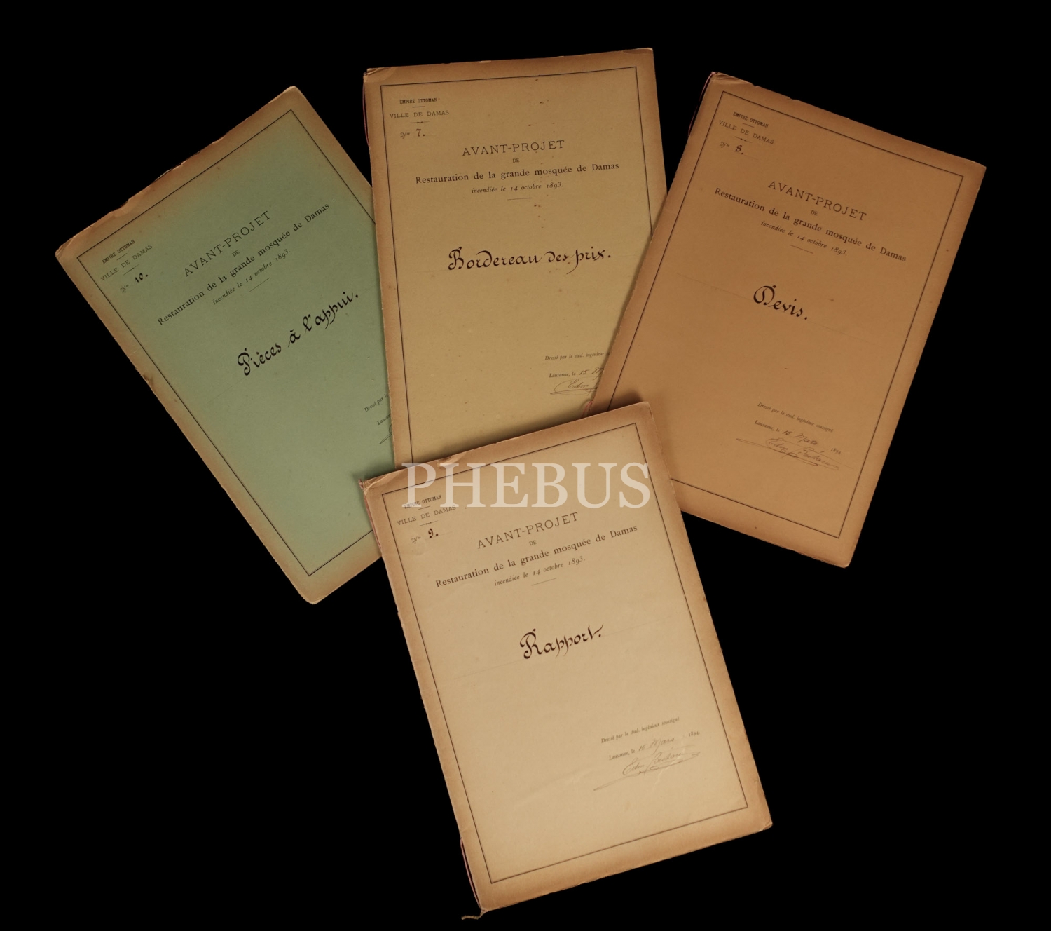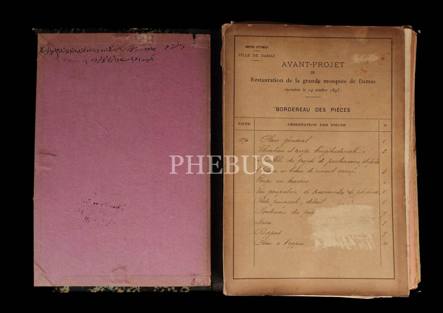 15 Eylül 1893 tarihinde yanan Şam Emeviyye Camii´nin restorasyonuna dair çok sayıda belge içeren 10 adet Fransızca rapor ile raporların Osmanlıca ve Arapça tercümeleri, 23x32 cm...