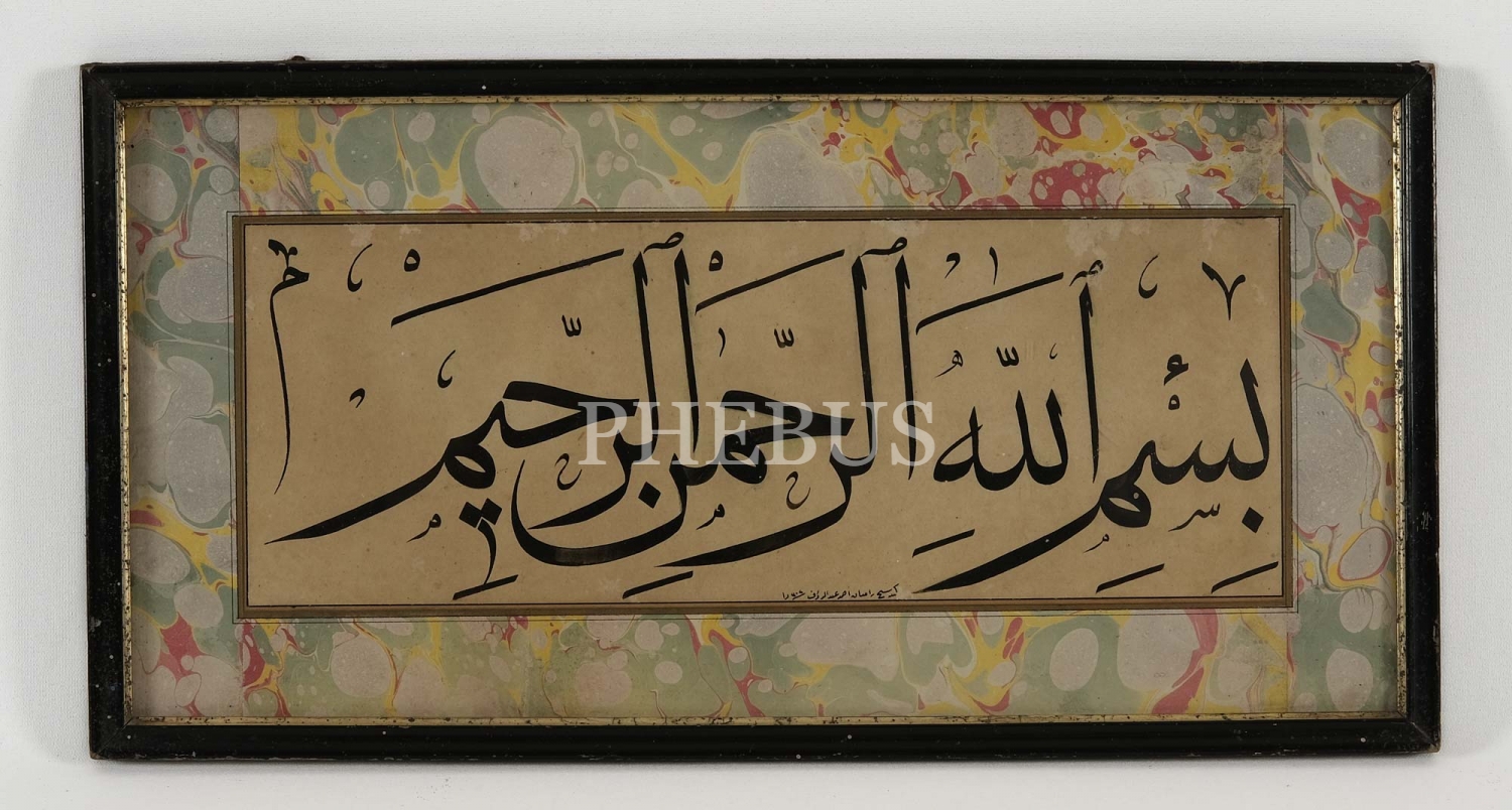 Muhakkak "Besmele-i Şerife", ebru paspartulu, 1302, çerçevesiyle birlikte 48x25 cm...