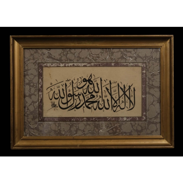Sülüs "Kelime-i Tevhid" levha, ebru paspartulu, 1360, çerçevesiyle birlikte 48x33 cm...