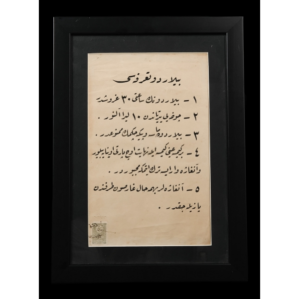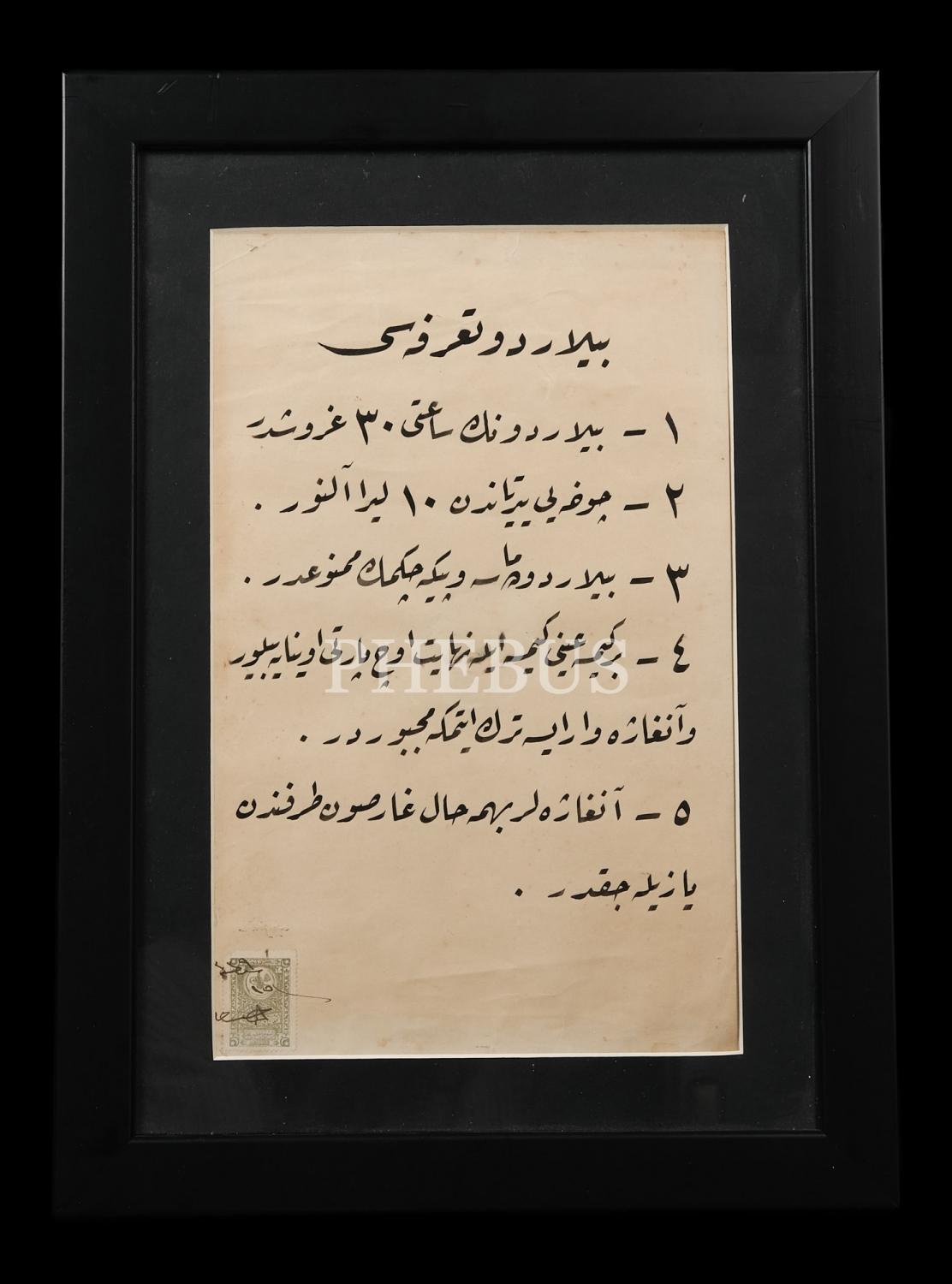 "Bilardo Tarifesi" başlıklı, bir bilardo salonunda uyulması gereken kuralların yazılı olduğu Osmanlıca el yazması afiş, çerçevesiyle birlikte 33x45 cm…