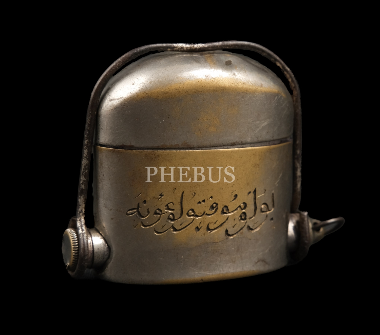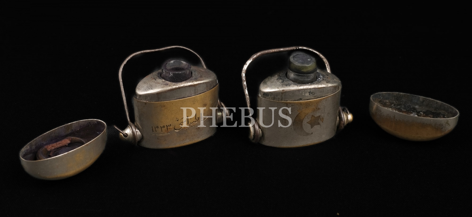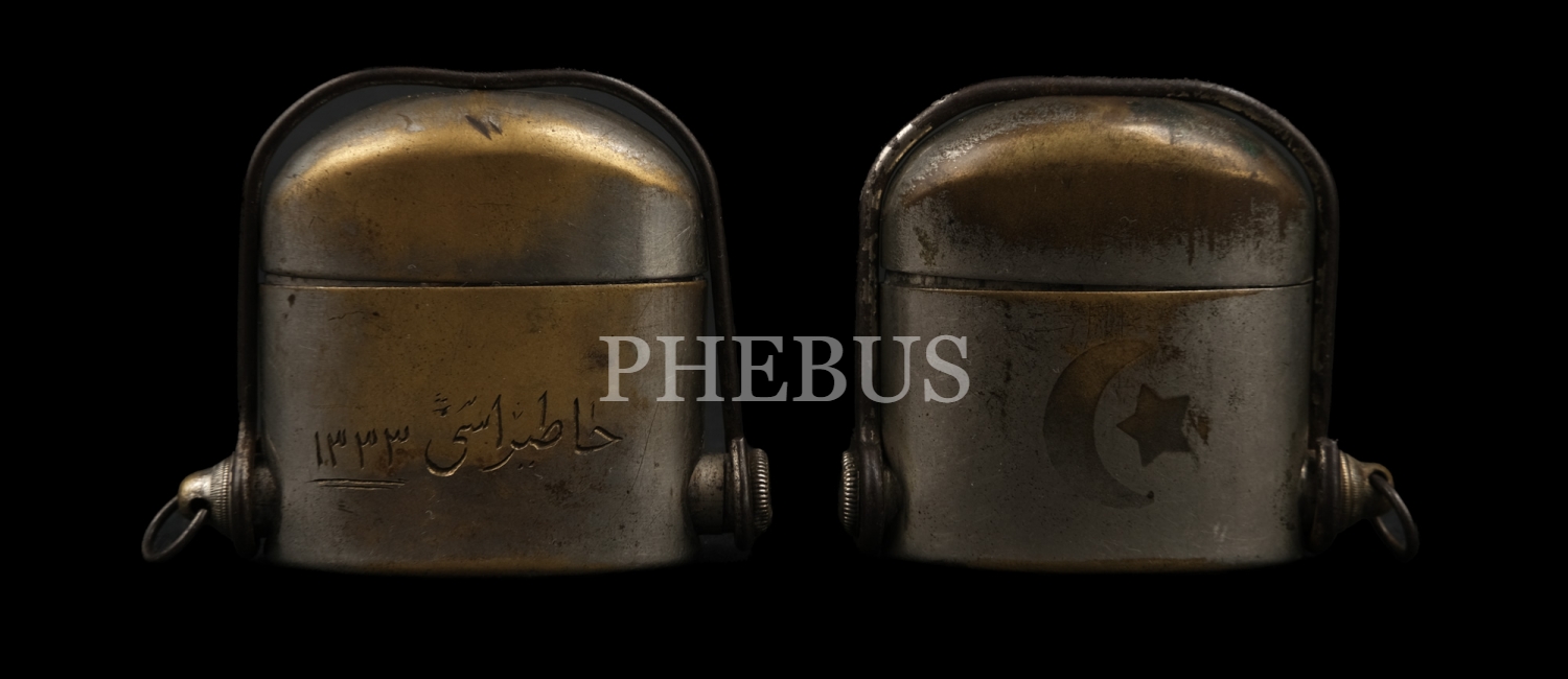 Birinin üzerine "1333 Hatırası, Bolu Müftülüğüne" yazısı, diğerine ise ay-yıldız motifi hakkedilmiş iki adet metal seyahat hokkası, 4,5x2x5 cm...