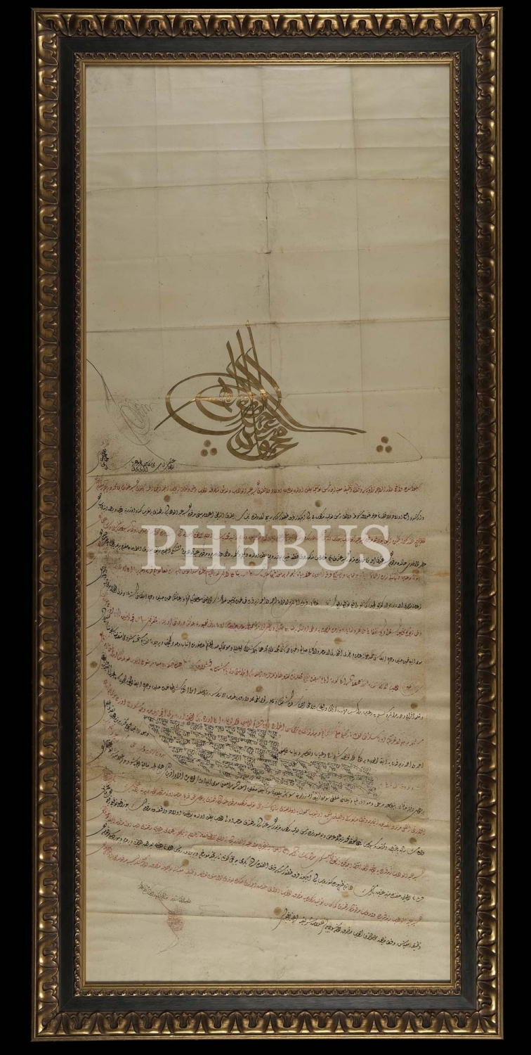 Sivas'ta bulunan Daru'r-raha vaziyesi re's tevliyet batınının akrabalar ve evlad-ı vakıf arasında tevdiyet değiştirmesi ve Kütahya'da bazı köylerin zammetlerinin değiştirilmesi hakkında Sultan II. Mahmud tuğralı berat, çerçevesiyle birlikte 137x63 cm...