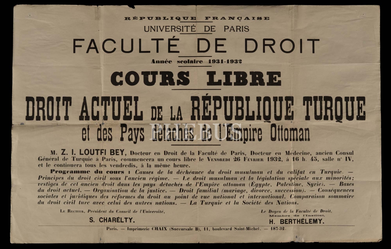 Paris eski Başkonsolosu Doktor Lütfi Bey´in, 26 Şubat 1932 itibariyle Paris Üniversitesi Hukuk Fakültesi´nde başlayacağı, "Türkiye Cumhuriyeti´nin Mevcut Hukuku ve Osmanlı İmparatorluğu´ndan Ayrılan Ülkeler" ana başlıklı ücretsiz kursunun Fransızca duyuru afişi, Imprimerie Chaix - Paris, 50x32 cm...