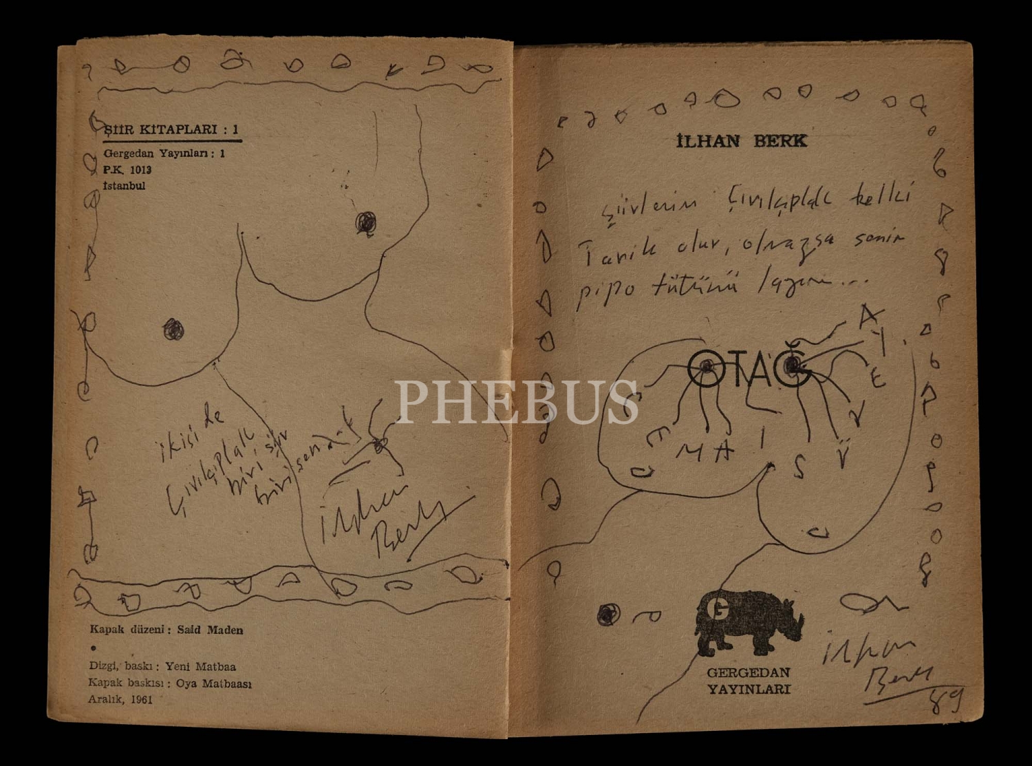 İlhan Berk´in nü çizimleri arasındaki, "İkisi de çırılçıplak biri şiirlerim biri sen, şiirlerim çırılçıplak belki tarih olur, olmazsa senin pipo tütünü lazım" dediği ve çizdiği nü figürün göğüs ucundan çıkardığı her bir çizginin ucuna Cemal Süreya´nın adının harflerini yerleştirdiği ithafı ve imzası kitabın künye sayfasında yer almaktadır.