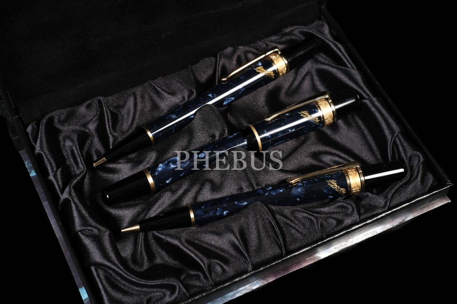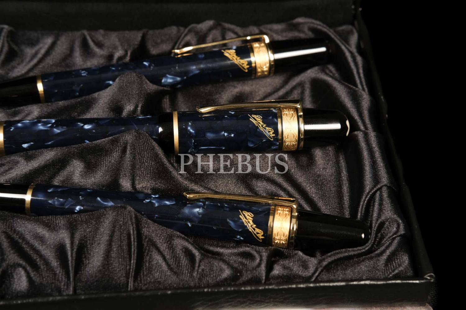 Montblanc´ın sınırlı üretim Yazarlar Serisinden, gizem, korku ve doğaüstü öyküleriyle tanınan Edgar Allan Poe´nun anısına 3000 adet üretilen kalem seti... Kalemlerin reçine gövdeleri ve kapakları, yazarın öykülerindeki mistik havayı temsil eden gece mavisi ebru efektleriyle süslenmiş, kapaklar üzerine Poe´nun altın renkli imzası nakşedilmiş, klipslerin altında yer alan altın kaplama halkalar Viktorya dönemine ait süslemelerle işlenmiş, dolma kalemin 18K altın ucu, Poe´nun dünyaca ünlü öyküleyici şiiri "Kuzgun"da geçen konuşabilen kuzgunun işlemeleriyle bezenmiştir...