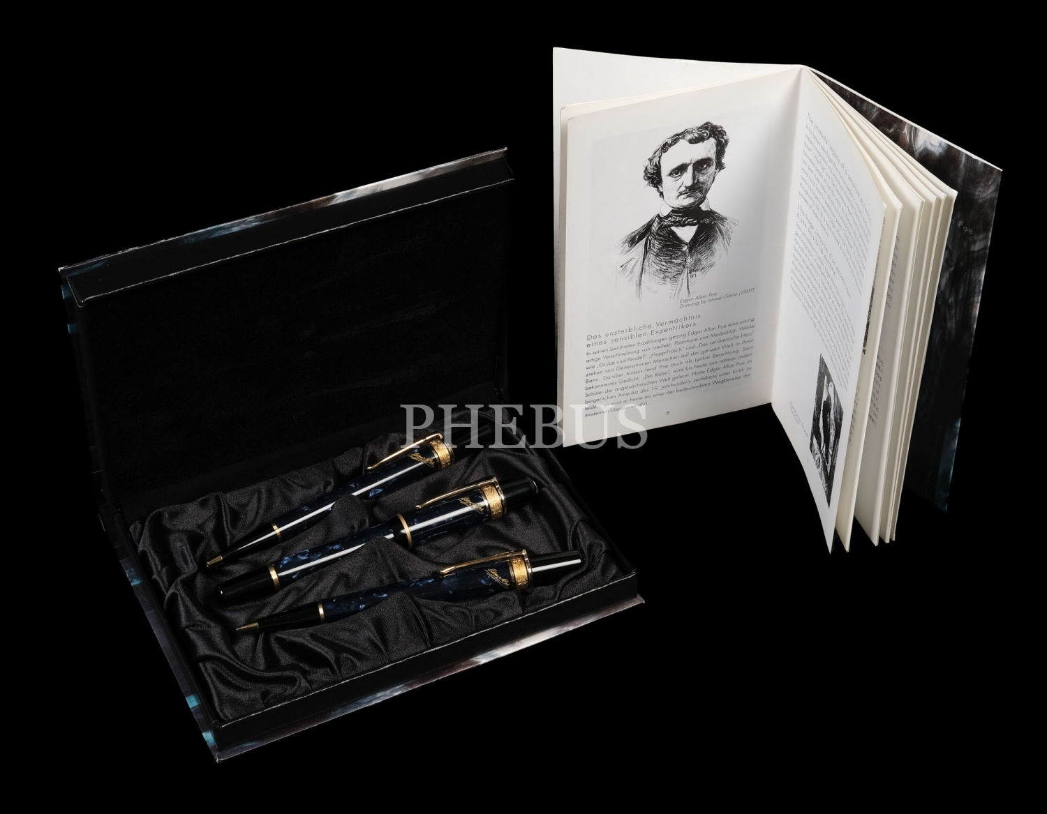 MONTBLANC 1998 Meisterstück Edgar Allan Poe set: 1 adet tükenmez kalem, 1 adet versatil kalem, 1 adet 18K altın M (medium) uç dolma kalem, sınırlı üretim (1727/3000), uluslararası hizmet sertifikasının yer aldığı, kitap formundaki orijinal kutusunda, kalemler 14 cm, kutu 14x19x4 cm...