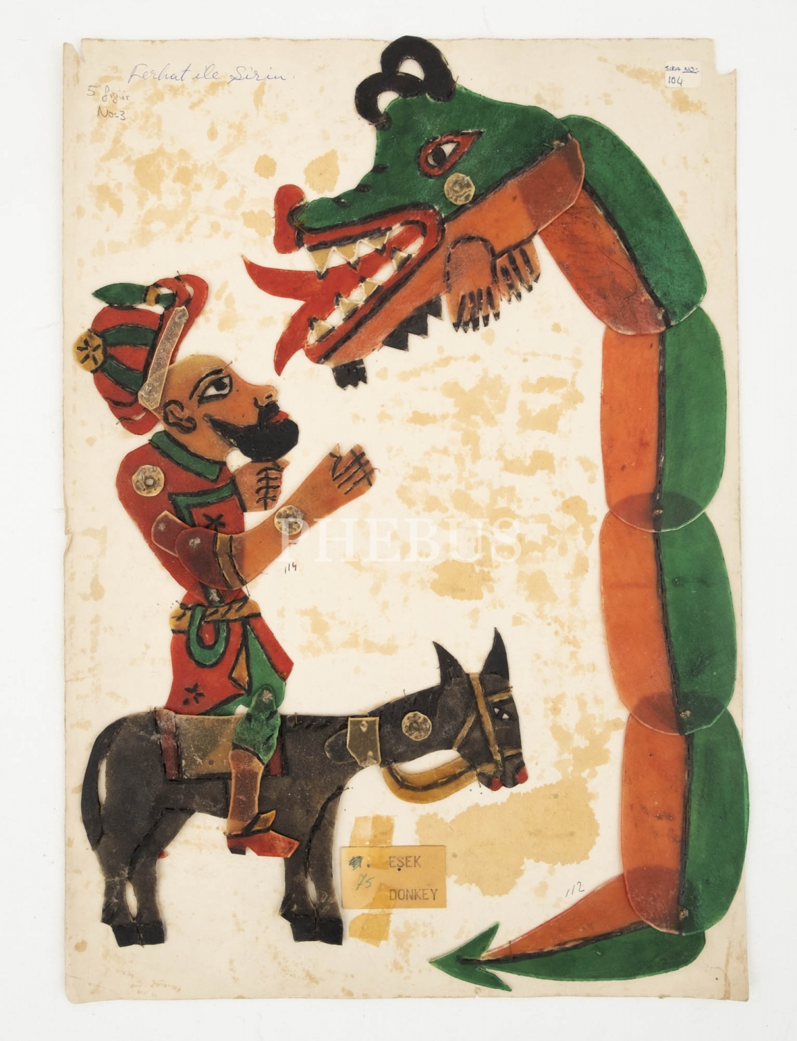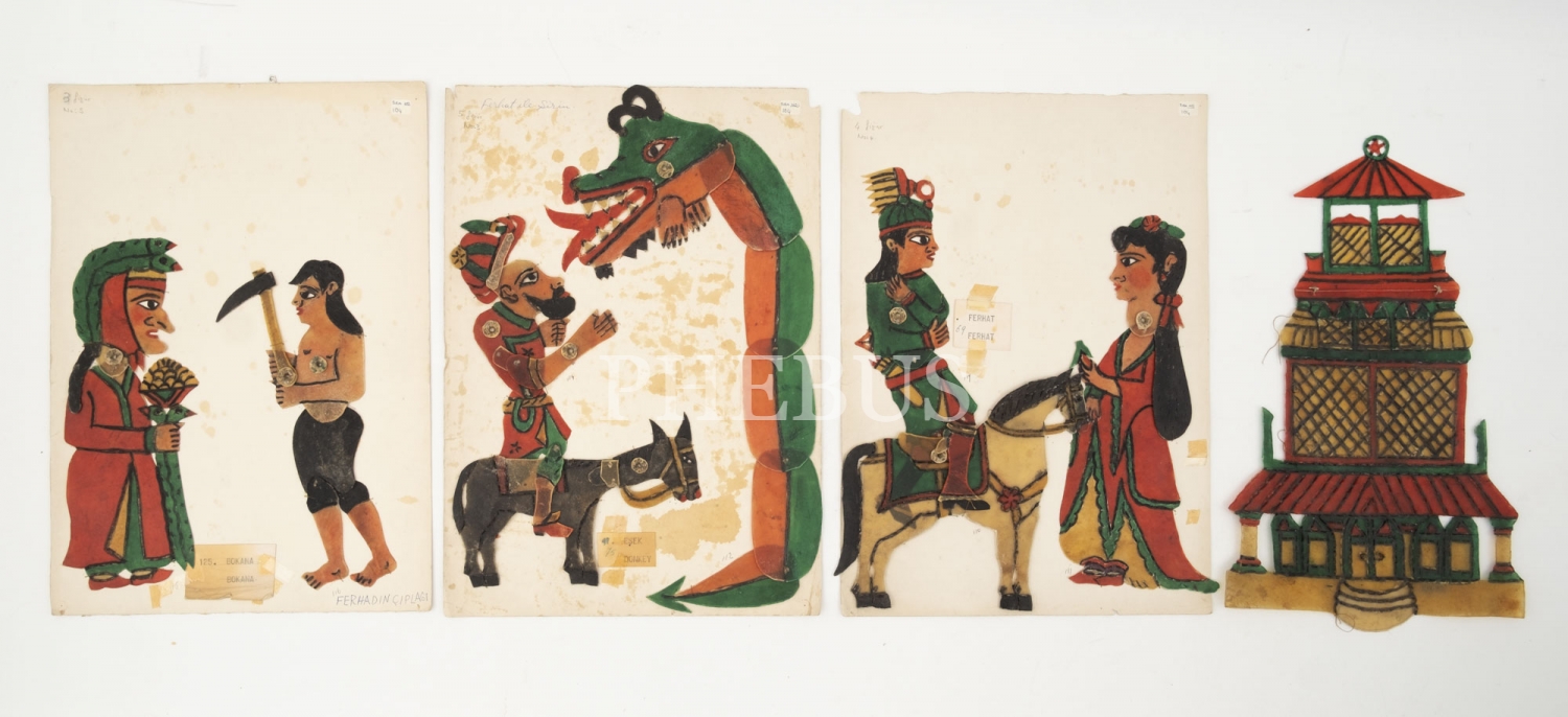 9 tasvirden oluşan lot içeriği, Karagöz, Şirin, Ferhat, Ferhat (dağı delerken), Bok Ana, Ferhat'ın atı, merkep, dev yılan, Şirin'in köşkü.