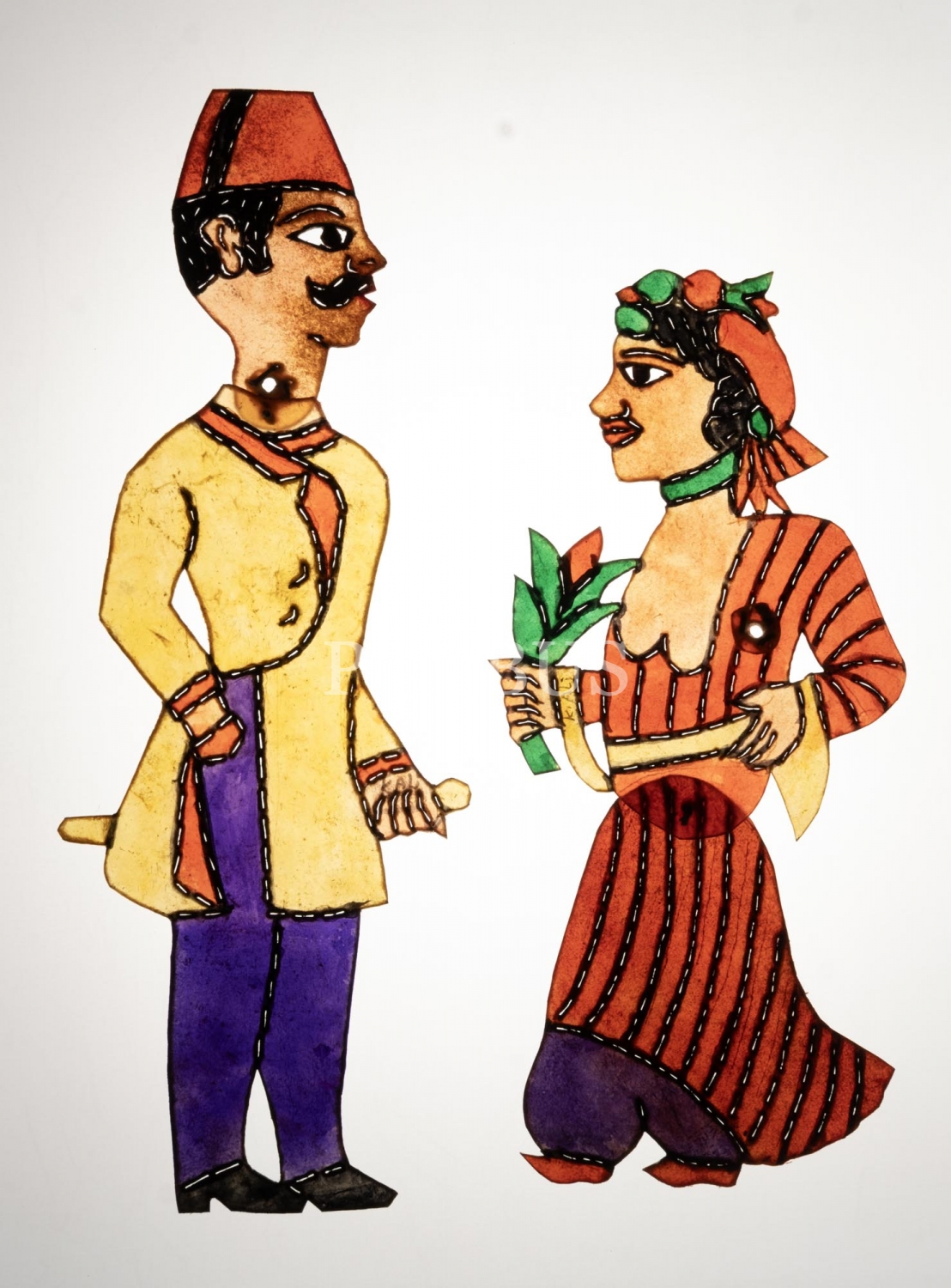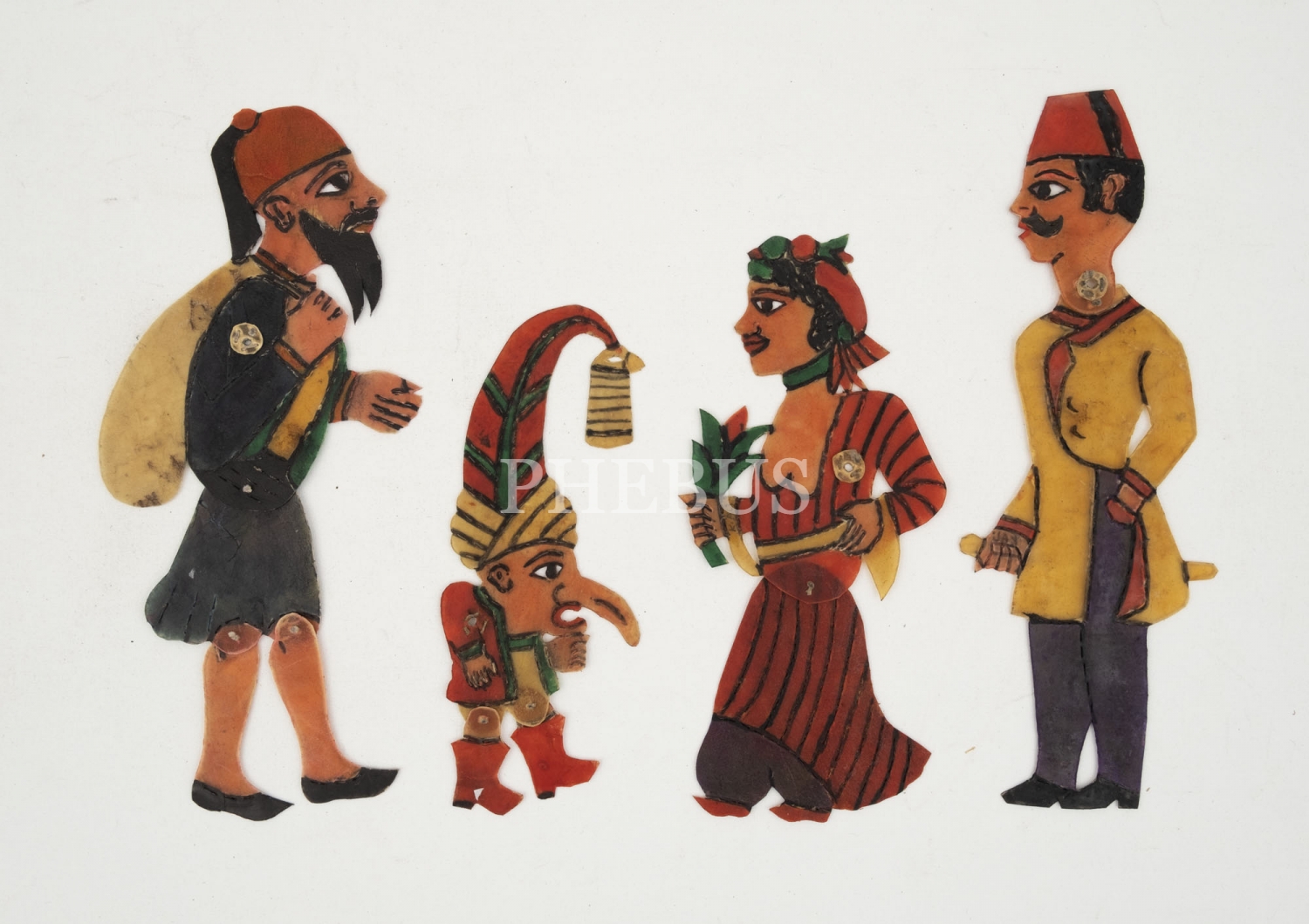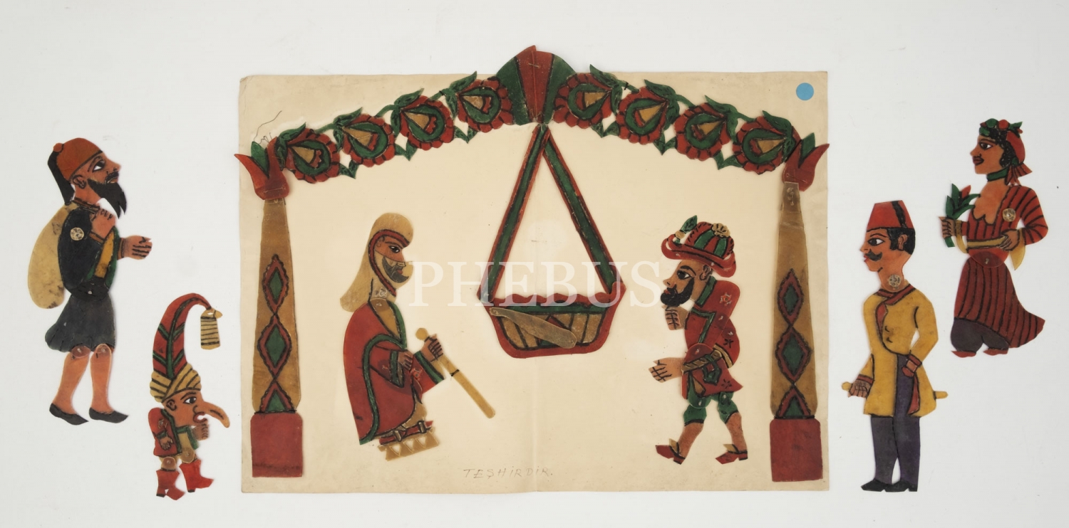 7 tasvirden oluşan lot içeriği, Karagöz, Hacivat kadın kılığında, Bebe Ruhi, zenne, Çelebi, Yahudi, salıncak.
