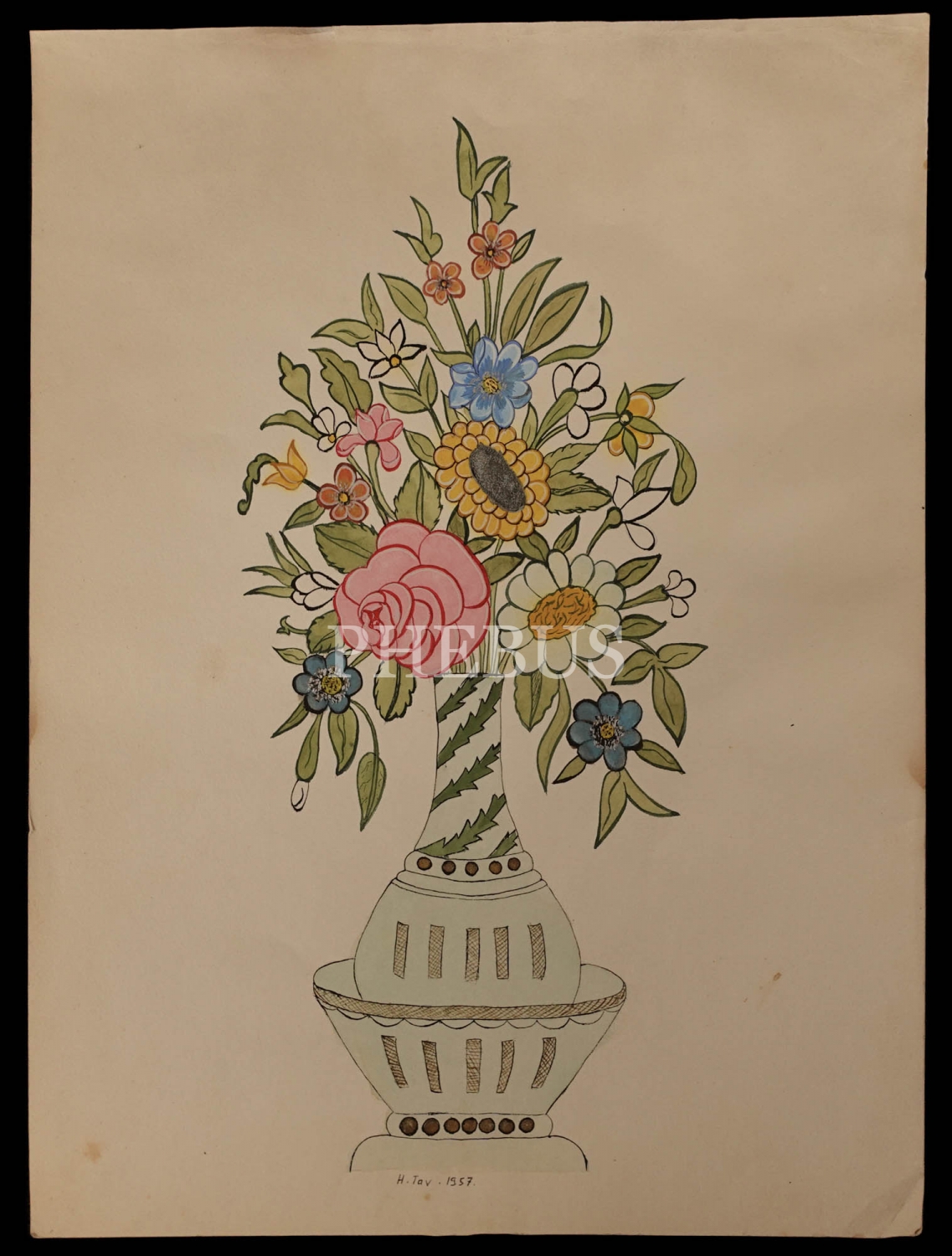 Süheyl Ünver´in öğrencisi Heti Tav imzalı vazoda çiçekler çizimi, 1957, 24x33 cm...