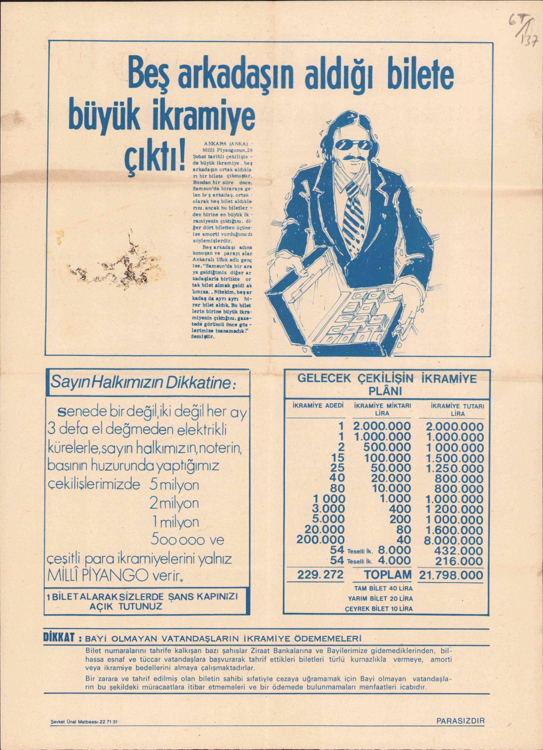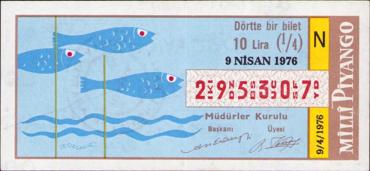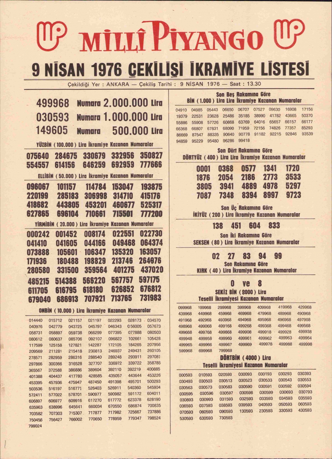 09 Ocak 1976 tarihli milli piyango çekilişi ikramiye listesi ve bileti, 11x5 cm 24x33 cm