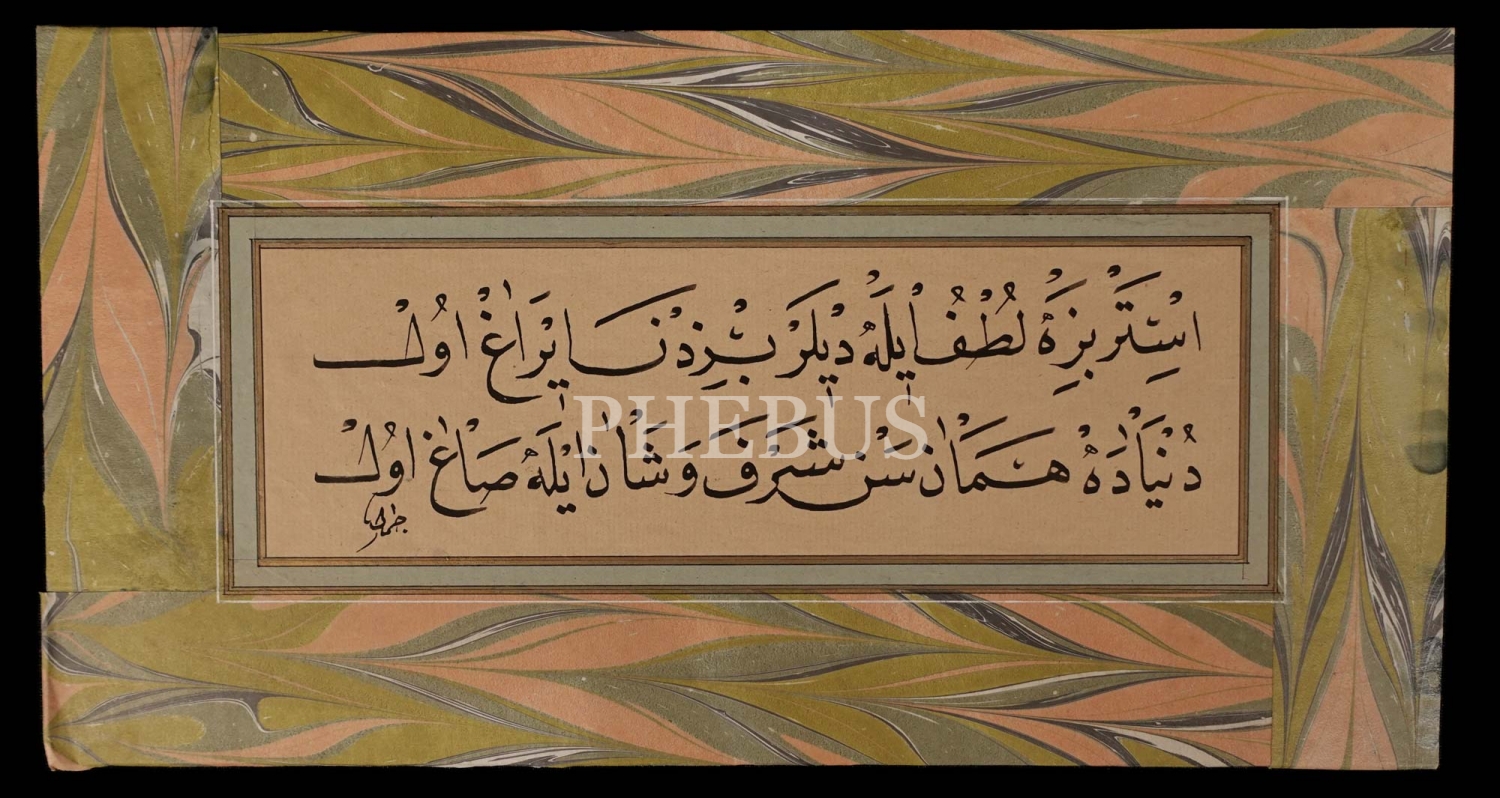 Cemal (Günter) ketebeli nesih yazı, ebru pervazıyla birlikte 34x18 cm...