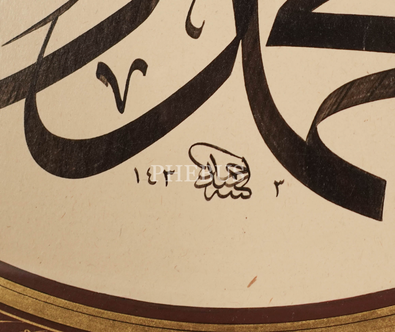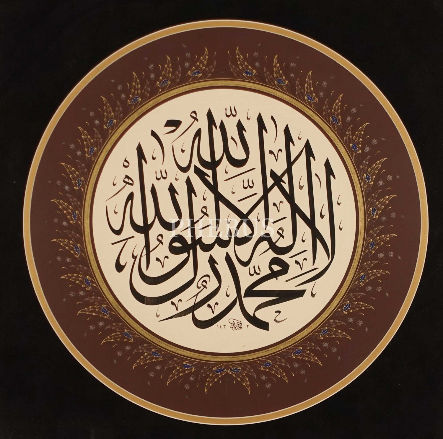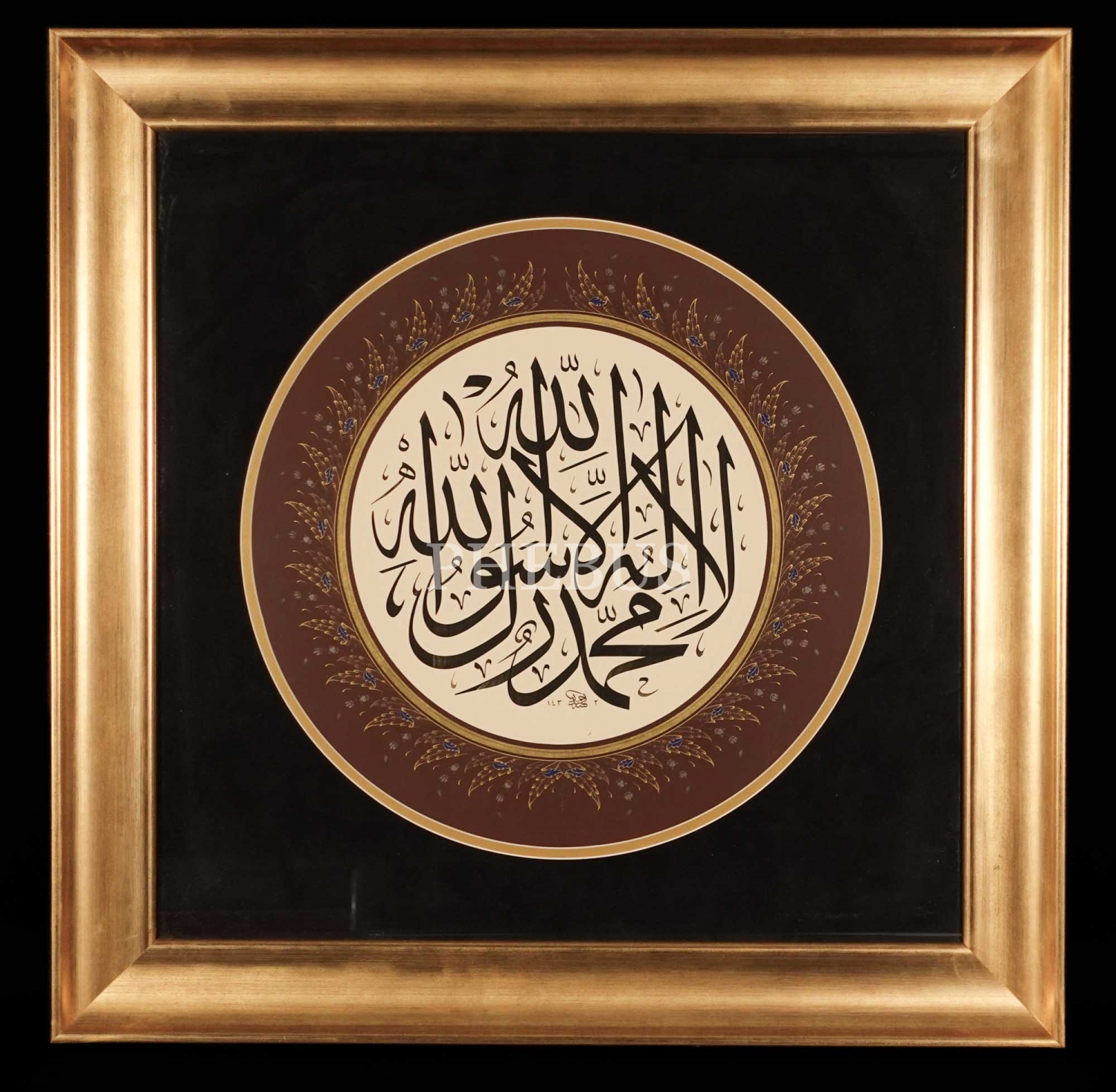 Seyit Ahmet Bursalı ketebeli, celî sülüs dairesel formda "Kelime-i Tevhid" istifi, 1433, çerçevesiyle birlikte 77x77 cm...