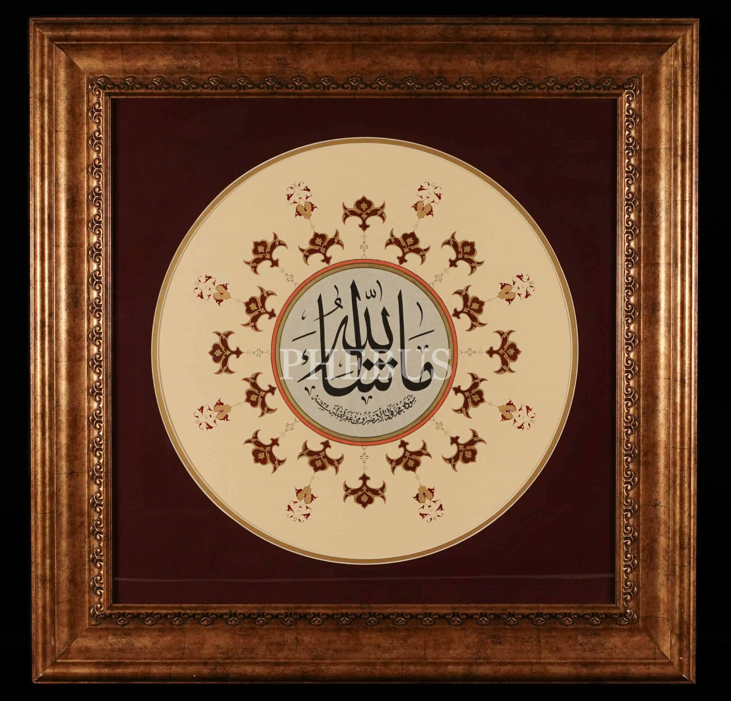 Fuat Başar ketebeli, celî sülüs dairesel formda "Maşallah" istifi, 1435, çerçevesiyle birlikte 74x74 cm...