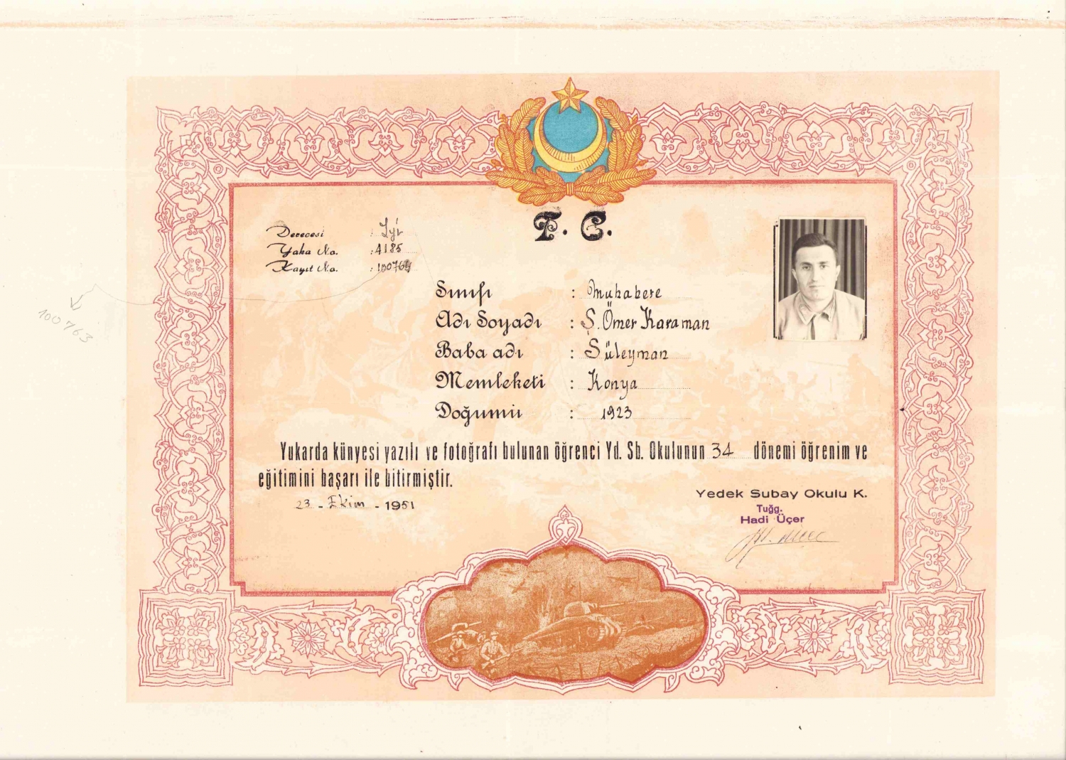 Yardımcı Subay Okulu diploması, 1951, 50x35 cm