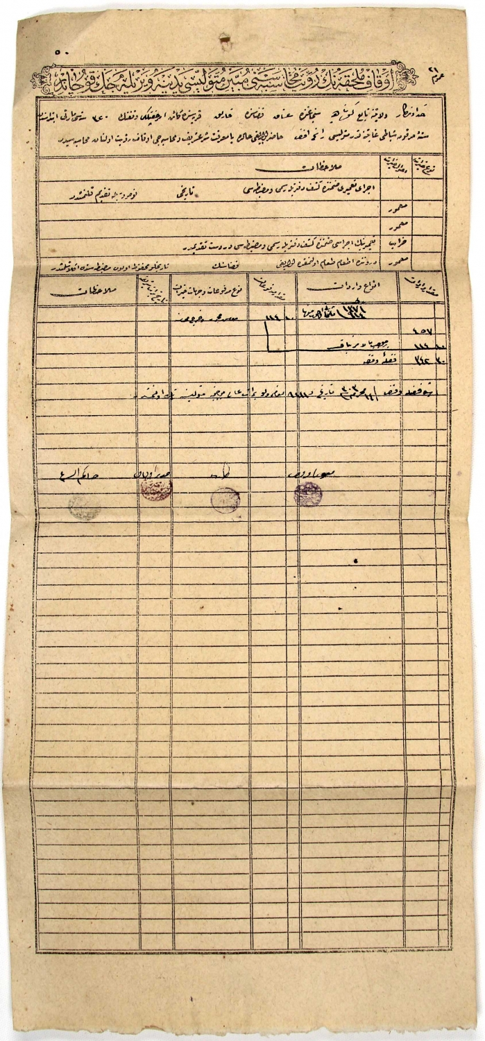 Osmanlıca Mülhak vakıflar tarafından mütevelliye verilen muhasebe koçanı, 1320 tarihli, 20x47 cm