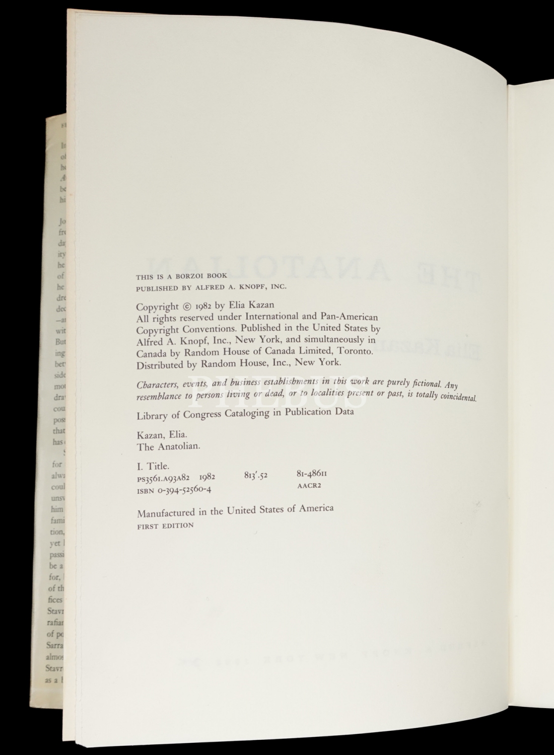 THE ANATOLIAN (A Novel), Elia Kazan, 1982, Alfred A. Knopf New York, 436 sayfa, 17x24 cm...