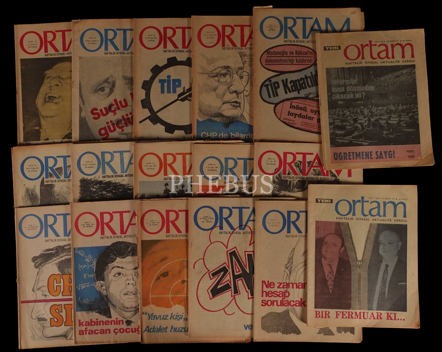 ORTAM Haftalık Siyasal Aktualite Dergisi´nin 1971 tarihli 2-12, 14-18 sayıları, 22x27 cm...